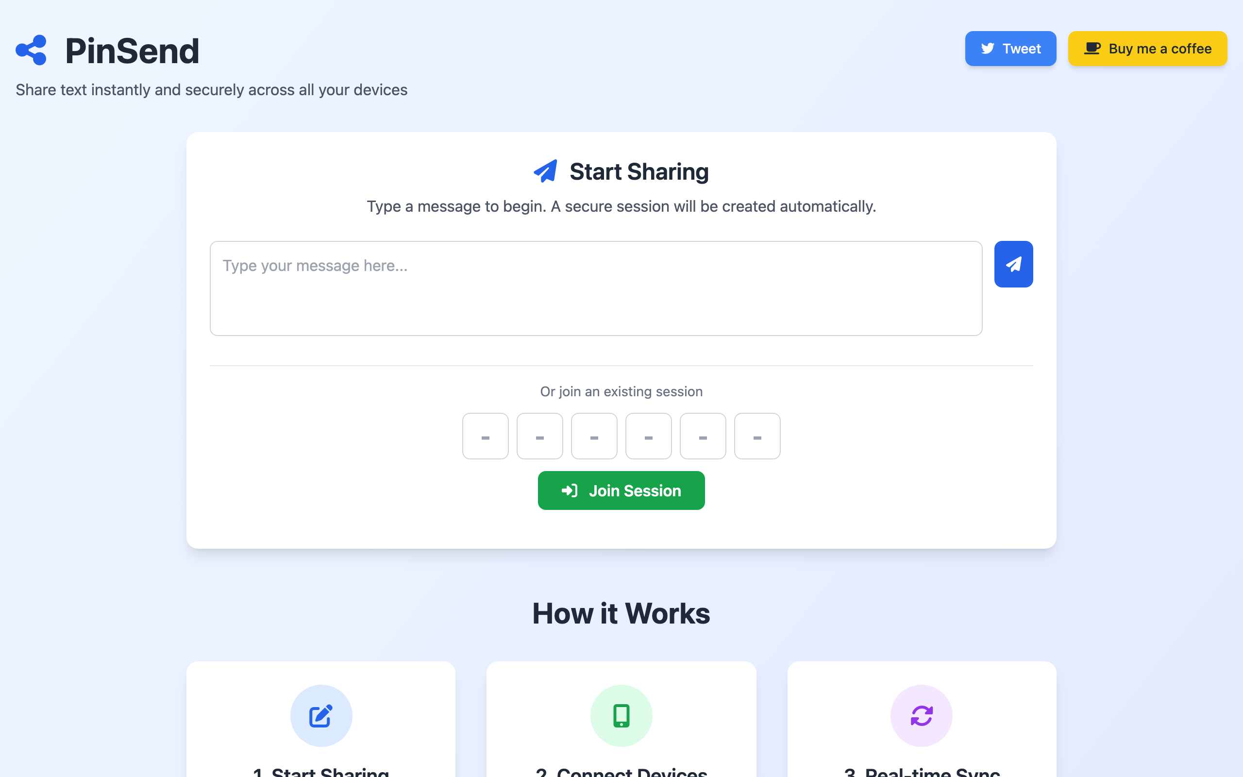 Hi HN, I built [PinSend]( https://pinsend.app ) — a free web app for instantly sharing text between devices, using a simple 6-character PIN. - No login, no account, no install. - Peer-to-peer WebRTC transfer (no server relay, no cloud). - Cross-platform: works on any modern browser. I buil