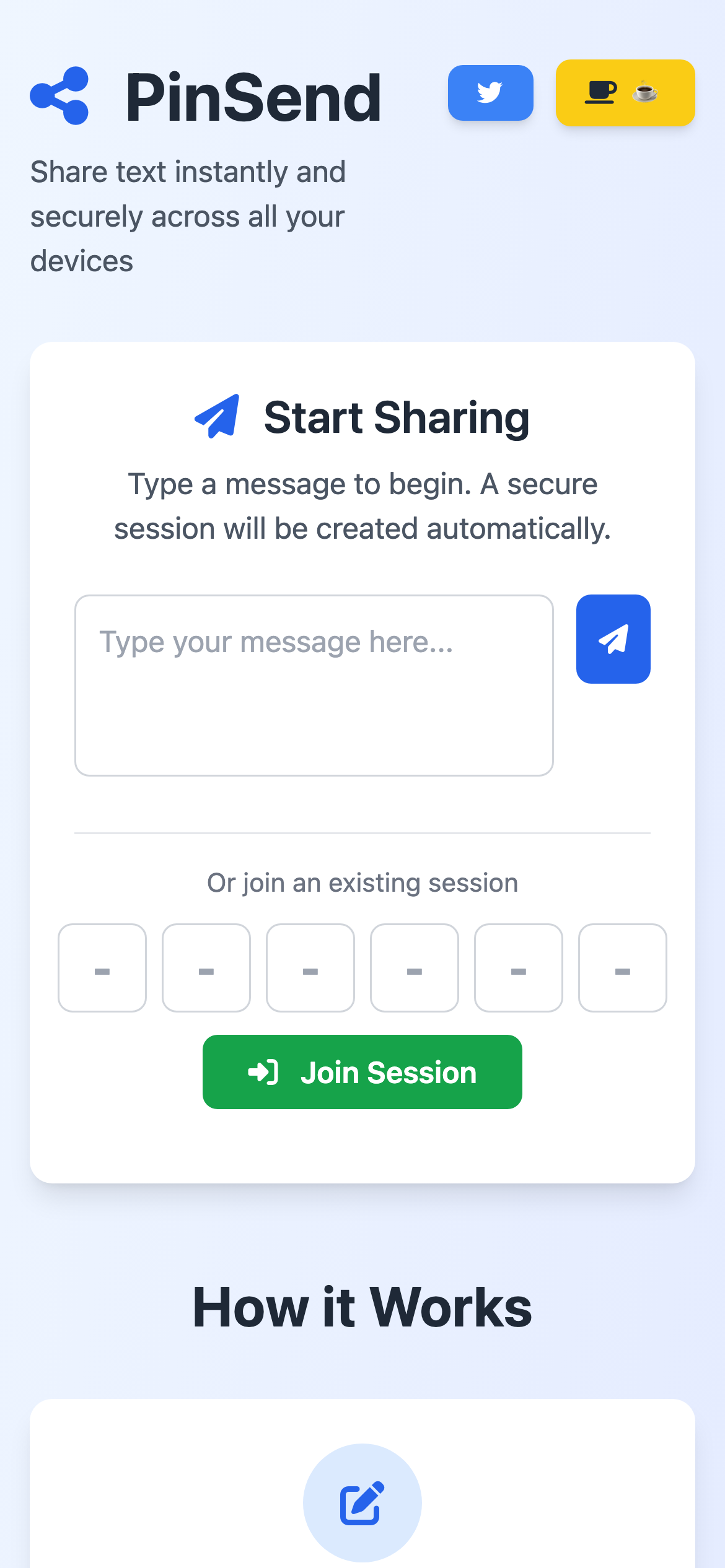 PinSend is a free web application that enables users to share text between devices using a simple 6-character PIN. The service requires no login, account creation, or software installation—users simply visit the website, enter text, and share the generated PIN with another device to receive the message. The application uses peer-to-peer WebRTC technology for direct device-to-device transfers, meaning data is not relayed through or stored on centralized servers. This approach prioritizes user privacy by keeping communications between devices rather than routing through cloud infrastructure. PinSend works across platforms on any modern web browser, making it accessible from smartphones, tablets, laptops, and desktop computers without platform-specific limitations. The service is designed for users who need quick, temporary text sharing without the friction of account setup or complex configuration. Typical use cases include transferring quick notes, links, or snippets between personal devices, sharing information with others nearby, or facilitating rapid text exchanges without requiring recipients to download applications or create accounts. The combination of accessibility, simplicity, and privacy-focused architecture positions PinSend as a straightforward alternative to cloud-based sharing tools or messaging applications for temporary text transfer needs.