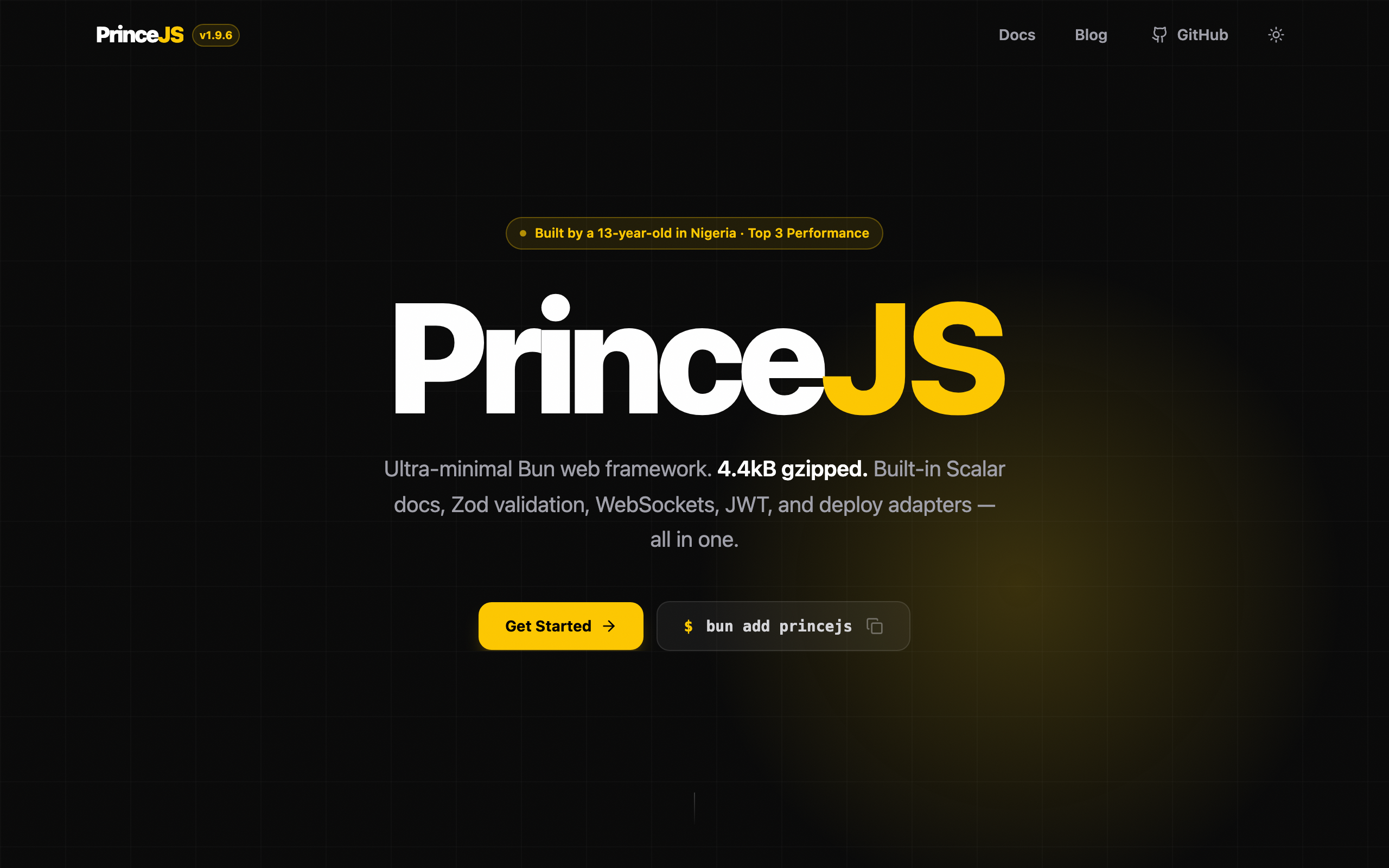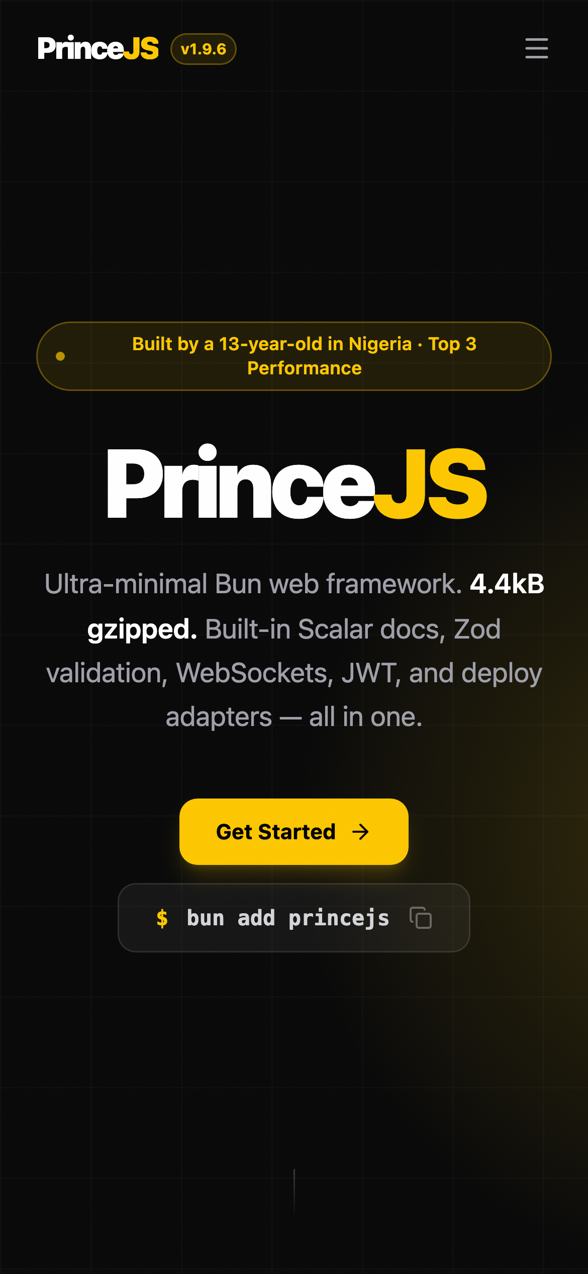 Hey HN, I'm 13, from Nigeria, and I just released PrinceJS — the fastest web framework for Bun right now. • 19,200 req/s (beats Hono/Elysia/Express) • 2.8 kB gzipped • Tree-shakable (cache, AI, email, cron, SSE, queue, test, static...) • Zero deps. Zero config. Built in < 1 we