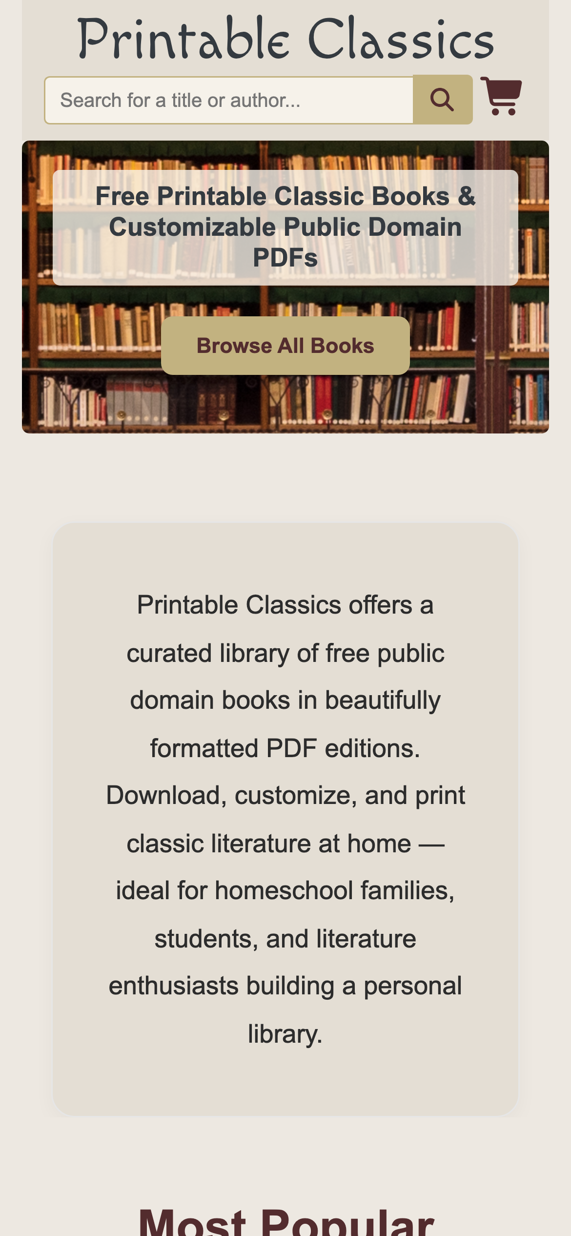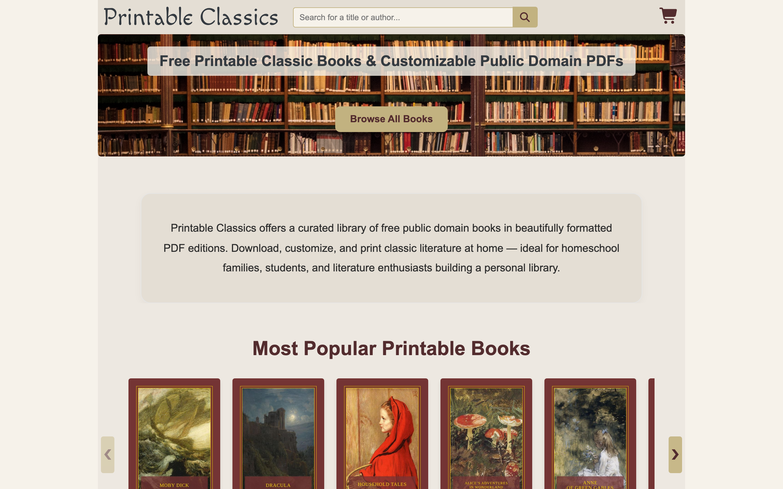 Printable Classics is a web-based tool that allows users to download and customize classic books for printing or digital reading. The platform provides access to public domain literature with adjustable formatting options, including font size, page size, margins, and custom cover designs. Users can work with books in multiple formats—EPUBs, HTML files, or PDFs—which are converted into professionally formatted documents through the site's custom software pipeline. The service is designed for readers who want personalized versions of classic literature tailored to their specific reading preferences and physical constraints. This includes people with vision accessibility needs, those with particular paper or device size requirements, and readers who prefer customized aesthetics for their personal libraries. Printable Classics operates on a freemium model, with a free tier available to all users. The platform combines a curated collection of classic books with user-controlled customization tools, distinguishing it from standard ebook repositories by emphasizing print-ready output and individual formatting control. The tool serves both casual readers seeking convenience and those who require specific accessibility or formatting accommodations for comfortable reading experiences.