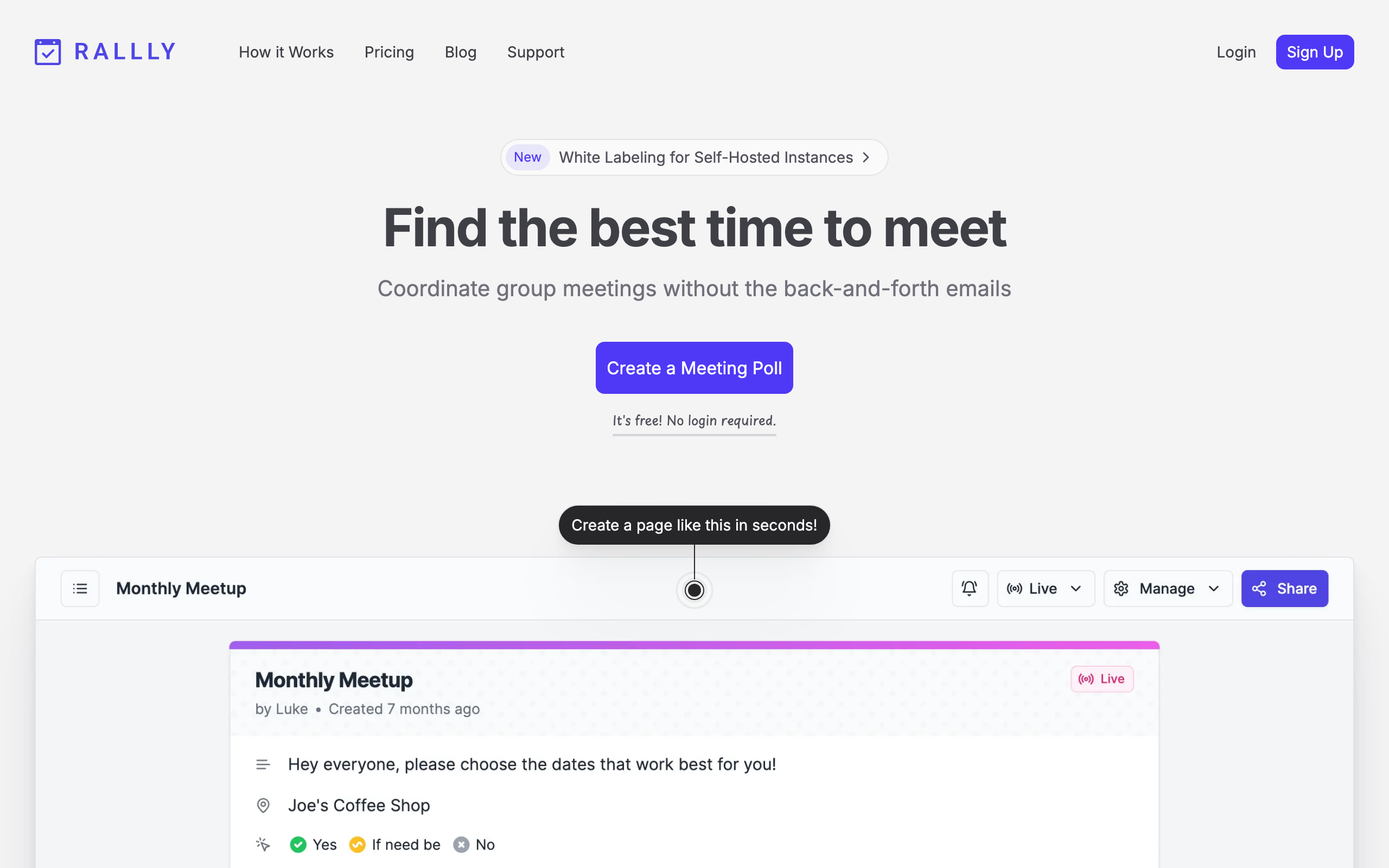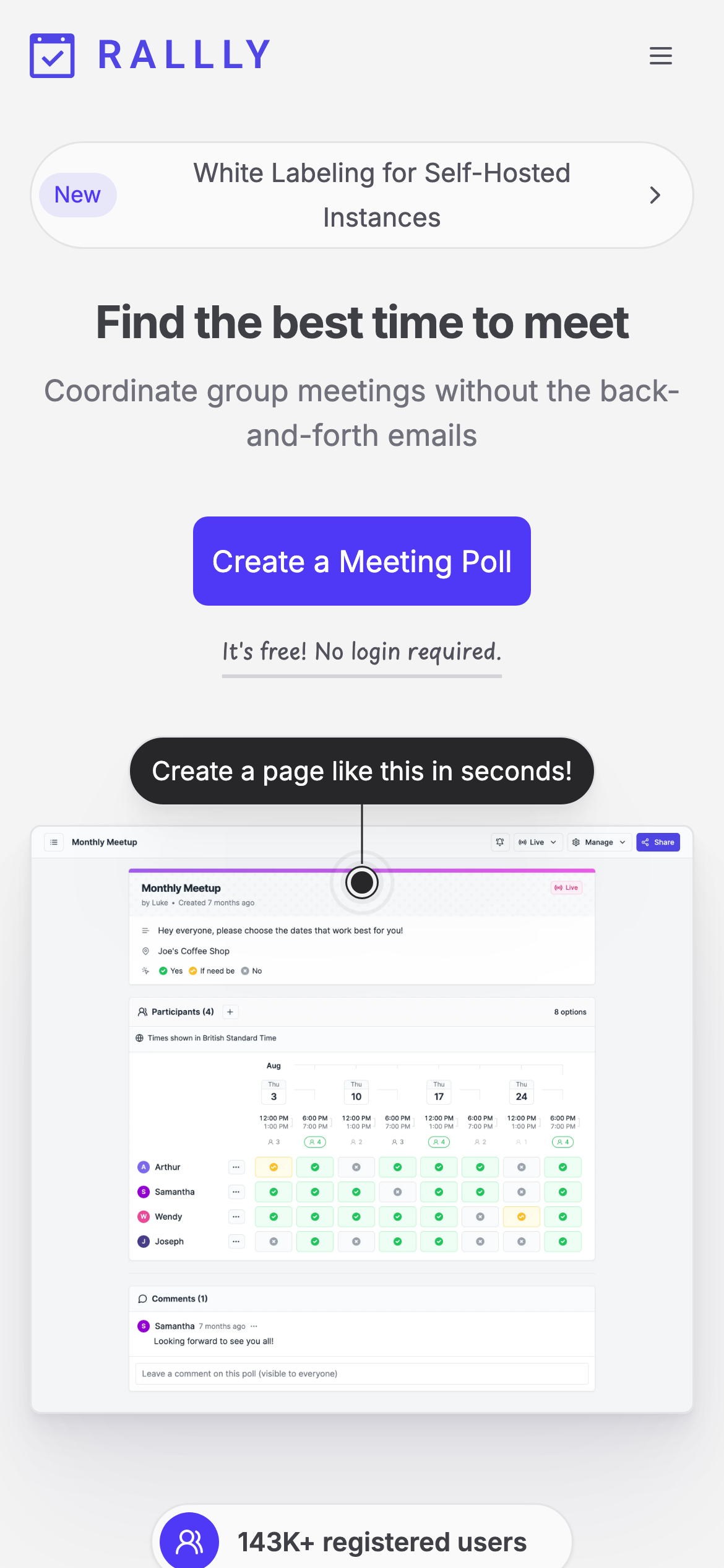 Rallly is the fastest and easiest scheduling and collaboration tool. Create a meeting poll in seconds, no login required.