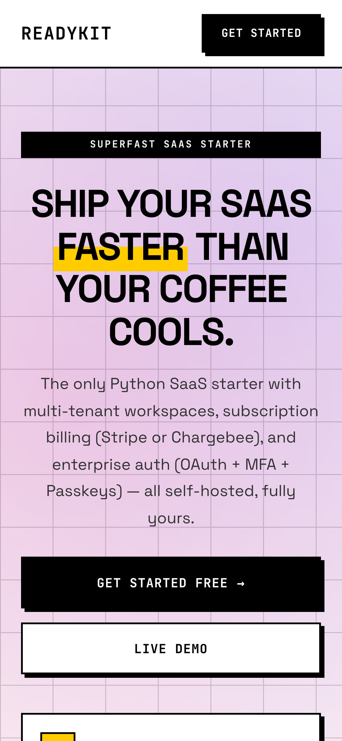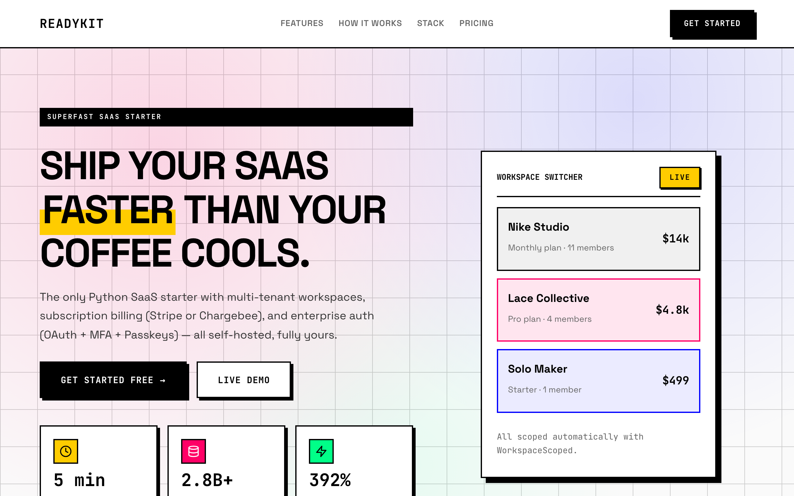 Hi HN! I've been building ReadyKit, an open-source SaaS boilerplate that handles all the hard parts: multi-tenant workspaces, Stripe billing, OAuth + MFA authentication, and a production-ready stack. Built with Python/Flask, PostgreSQL, Redis, and Vue 3, it's designed for indie makers