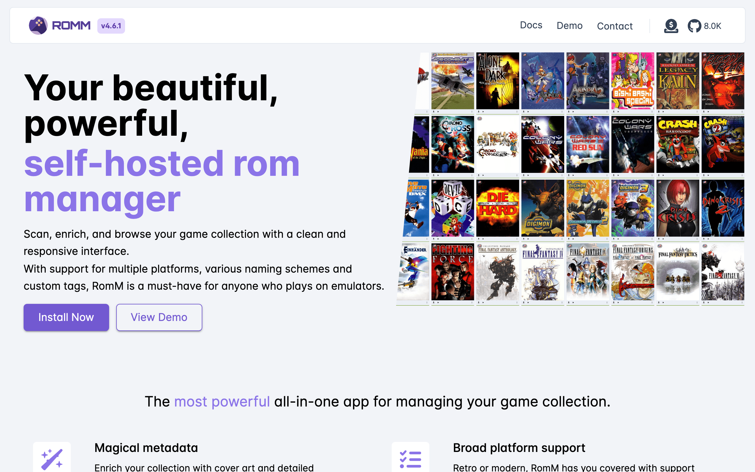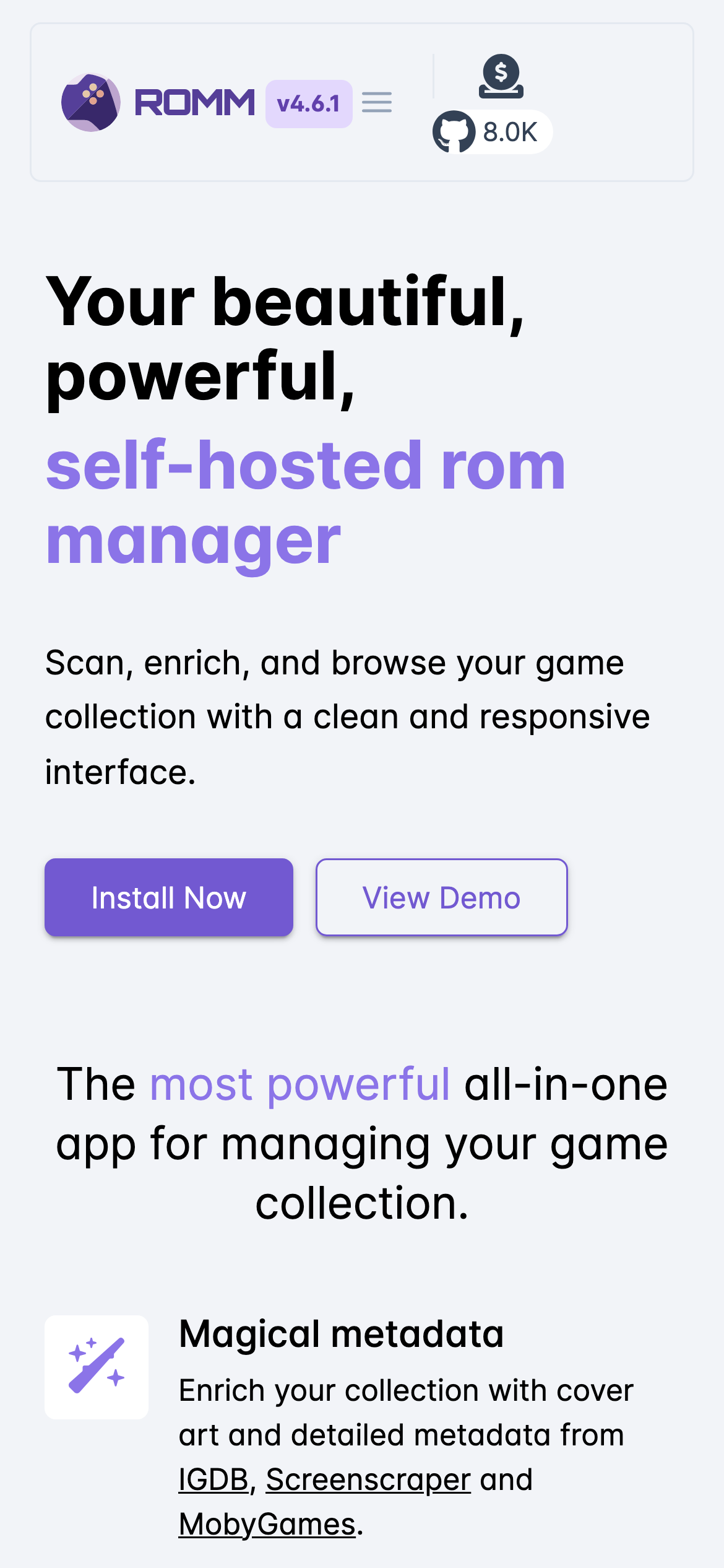 RomM is an open-source ROM manager designed for organizing, enriching, and playing retro games across 400+ gaming platforms. Built as a self-hosted application, it provides users with complete control over their retro game libraries without reliance on cloud services or third-party infrastructure. The platform serves retro gaming enthusiasts who want to consolidate their collections across multiple emulation systems in a single, web-based interface. RomM enables users to organize ROMs, enrich metadata, and launch games directly from the application, eliminating the need to manage multiple emulator interfaces. Key features include support for extensive platform coverage, self-hosted deployment for privacy and control, and a web-based interface accessible across devices. Being open-source, the project benefits from community contributions and transparency in its development. RomM differentiates itself through its comprehensive platform support and self-hosted architecture, appealing to users who prefer managing their gaming infrastructure locally rather than using proprietary solutions. The active community, documented on Discord and GitHub, provides ongoing development and user support. The project is available at romm.app with source code hosted on GitHub, making it accessible for users who want to deploy and customize their own instance.