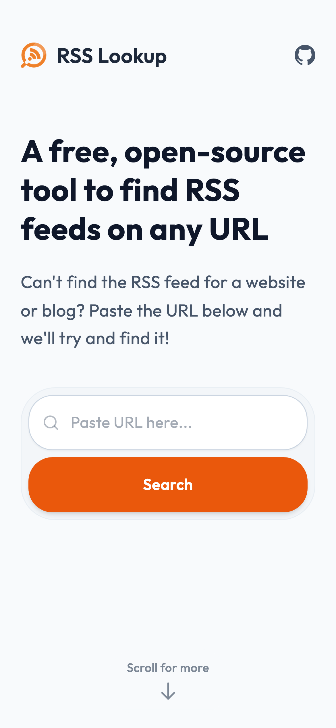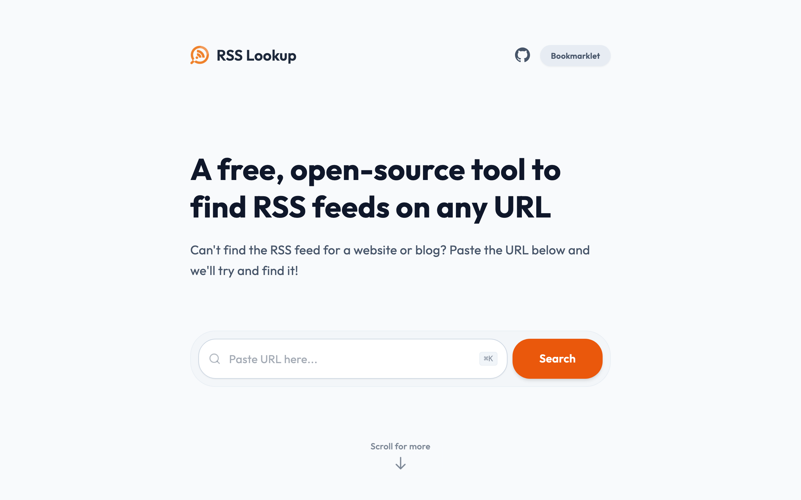 RSS Lookup is a free, open-source tool that helps users discover RSS feeds from any website or blog. The service addresses a common problem: many websites publish RSS feeds that are difficult to locate manually. By pasting a URL into RSS Lookup, users receive automatic detection of available feeds through multiple search methods, including scanning HTML meta tags and checking common feed path conventions. The tool is designed for anyone who consumes content through RSS readers or aggregation services and needs to find a site's feed URL. This includes productivity-focused individuals, researchers, journalists, and content curators who rely on RSS as part of their information workflow. RSS Lookup operates as a straightforward web-based utility without registration or account requirements. The application fetches target websites and systematically searches for RSS feeds, eliminating the manual process of inspecting site source code or guessing feed URLs. The service has been available for several years and recently received UI improvements and enhanced feed detection capabilities. As an open-source project, RSS Lookup's code is publicly available on GitHub, allowing developers to review, modify, or self-host the tool. The project requires no payment or subscription, making it accessible to all users regardless of budget constraints.