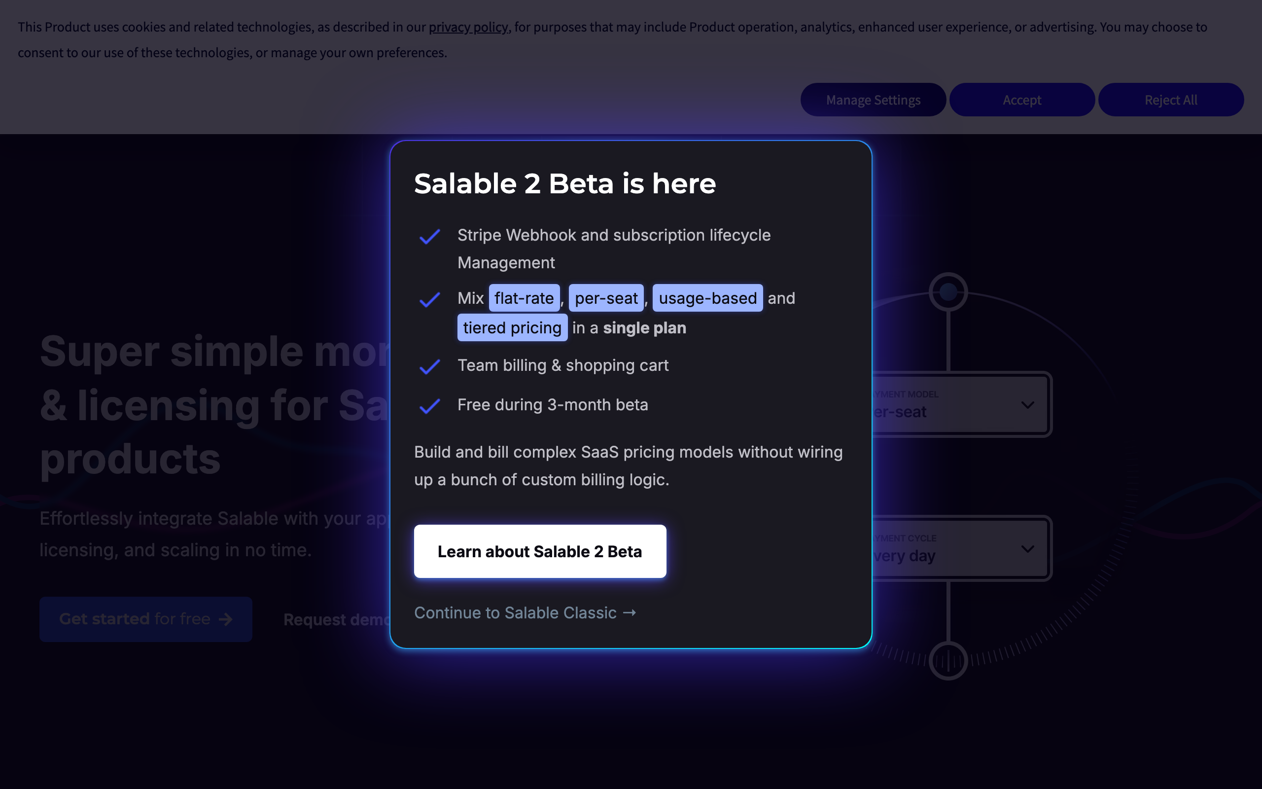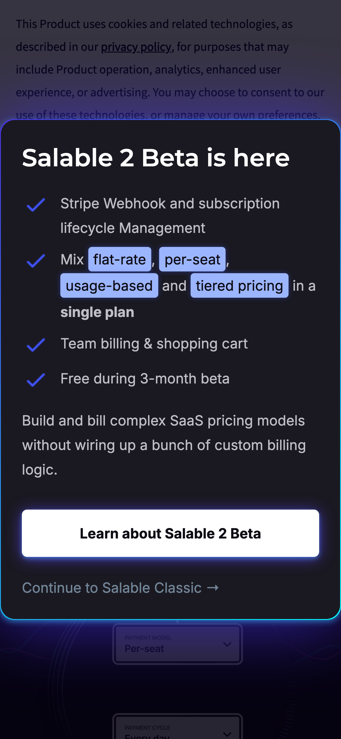 Salable is an open source licensing and pricing infrastructure platform designed for SaaS companies. It provides developers with the core tools needed to monetize applications, manage subscriptions, and handle complex billing scenarios without building custom payment logic from scratch. The platform enables companies to implement multiple pricing models within a single plan, including flat-rate, per-seat, usage-based, and tiered pricing structures. Salable integrates with Stripe for payment processing and manages the complete subscription lifecycle, including webhook handling and subscription event management. Salable is built for SaaS founders and development teams who need a flexible billing foundation but want to avoid the complexity of building proprietary subscription management systems. Rather than requiring extensive custom billing logic, the platform abstracts common SaaS monetization patterns into configurable components. As an open source solution, Salable allows teams to self-host, inspect the codebase, and customize the infrastructure to match their specific business requirements. The platform reduces time-to-monetization by providing pre-built subscription management capabilities while maintaining flexibility for companies with non-standard pricing needs.