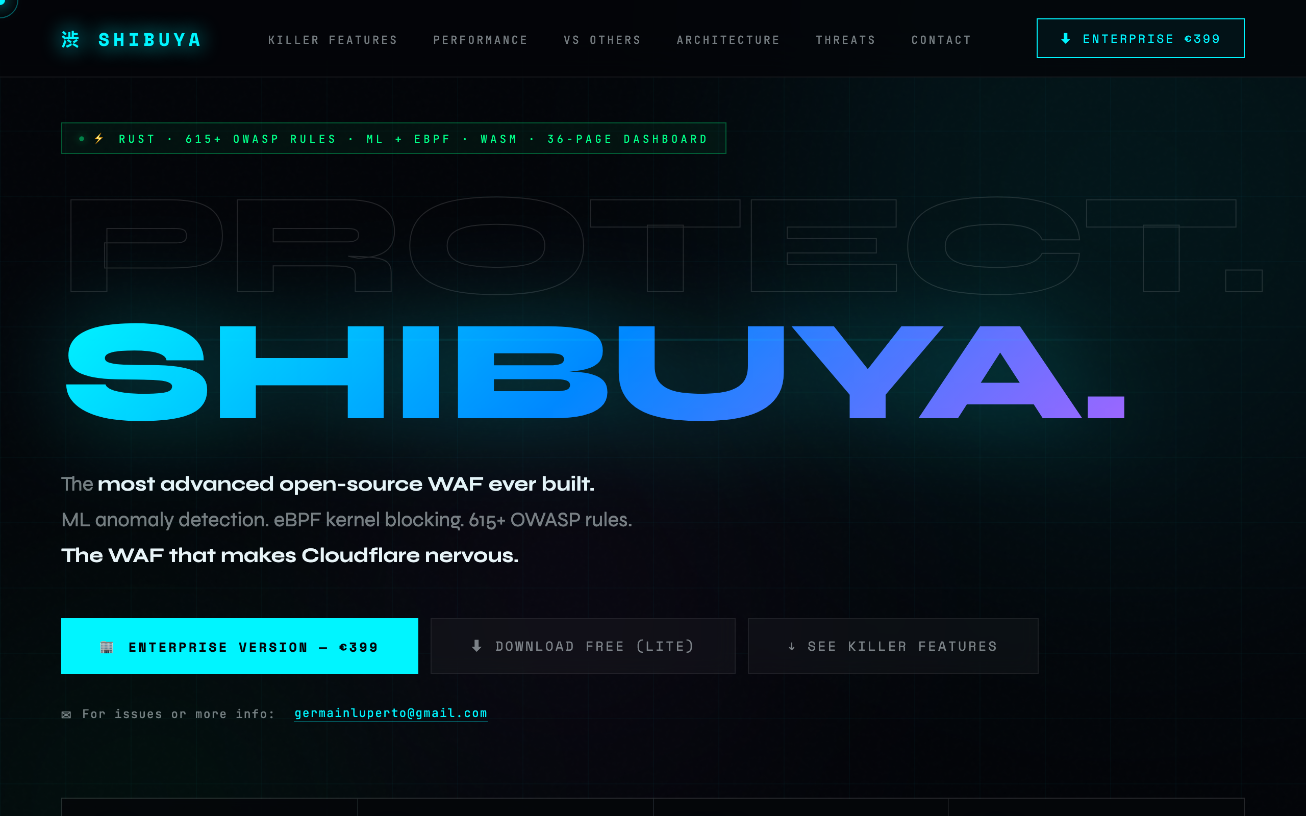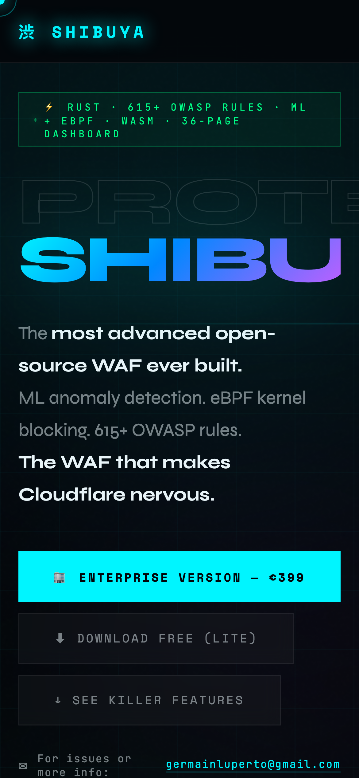 Shibuya is an open-source Web Application Firewall (WAF) built in Rust that provides real-time threat detection and prevention for web applications. Unlike traditional WAFs that rely on legacy regex-based signatures, Shibuya employs machine learning anomaly detection and kernel-level blocking through eBPF technology to identify and stop attacks at line-rate performance. The platform supports over 615 OWASP Core Rule Set rules and includes specialized protection for GraphQL APIs, addressing modern application security needs. It can detect and block common web exploits including SQL injection, cross-site scripting (XSS), and remote code execution attempts, with response times under 5 milliseconds. Shibuya is designed for development teams and security operations teams that need flexible, high-performance application protection without vendor lock-in. The open-source nature allows for customization and inspection of security logic. The platform supports WASM plugins, enabling users to extend functionality and tailor protections to their specific application requirements. As a Rust-based solution, Shibuya emphasizes performance and memory efficiency compared to traditional WAF implementations. It targets organizations seeking to move beyond signature-based detection toward intent-based threat analysis while maintaining the transparency and control that open-source software provides.