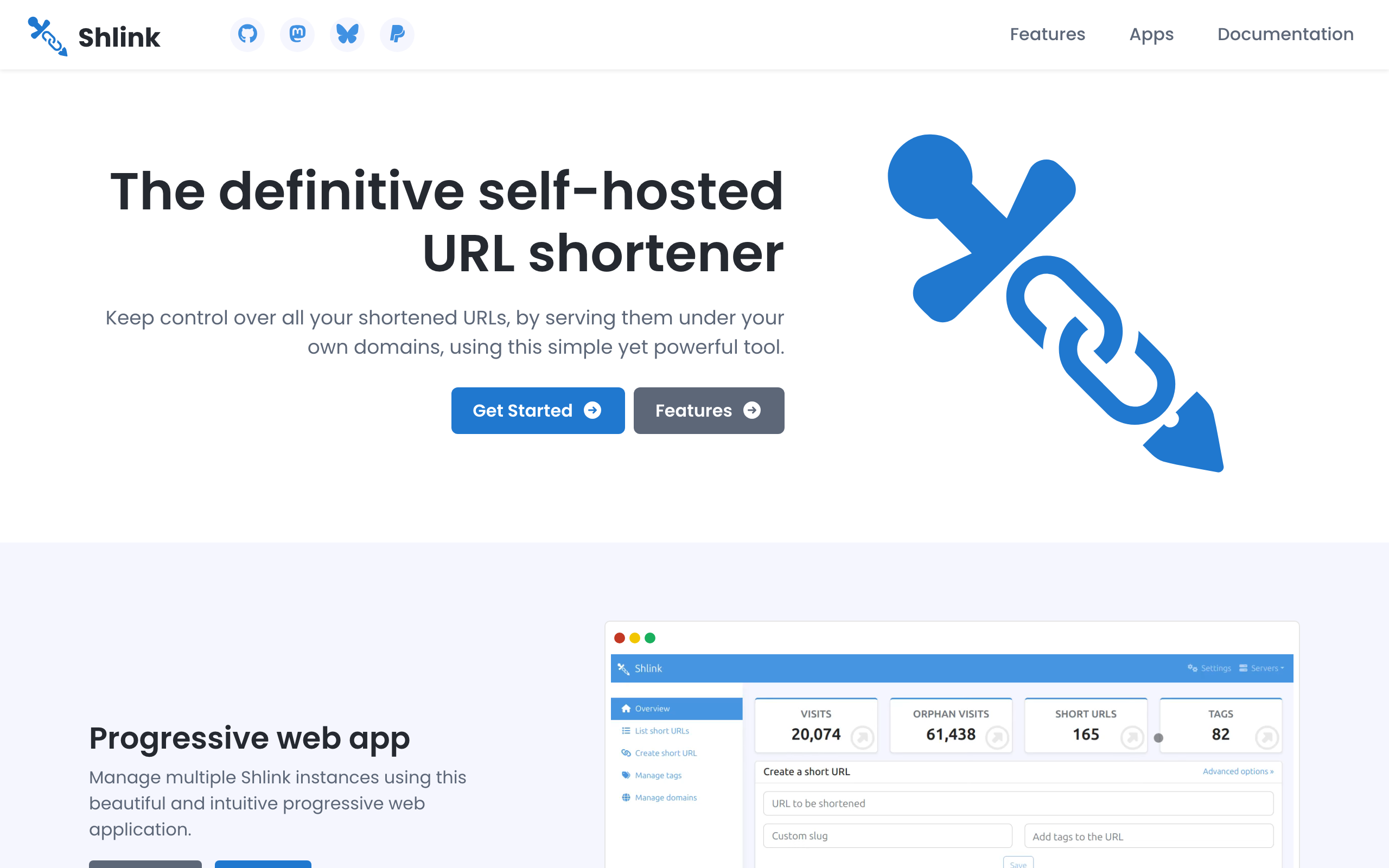URL shortener with REST API and command line interface. Includes official progressive web application and docker images. , [Clients](https://shlink.io/apps))