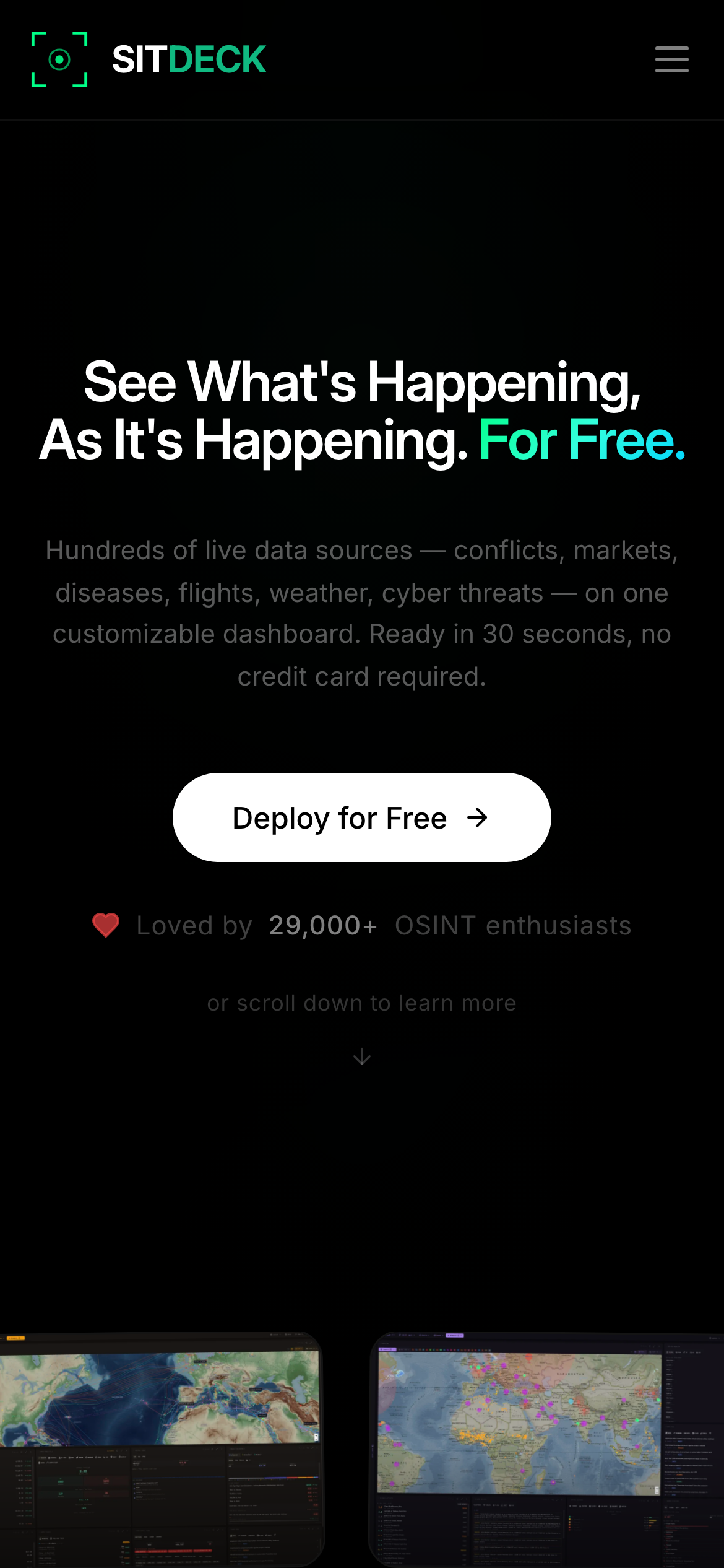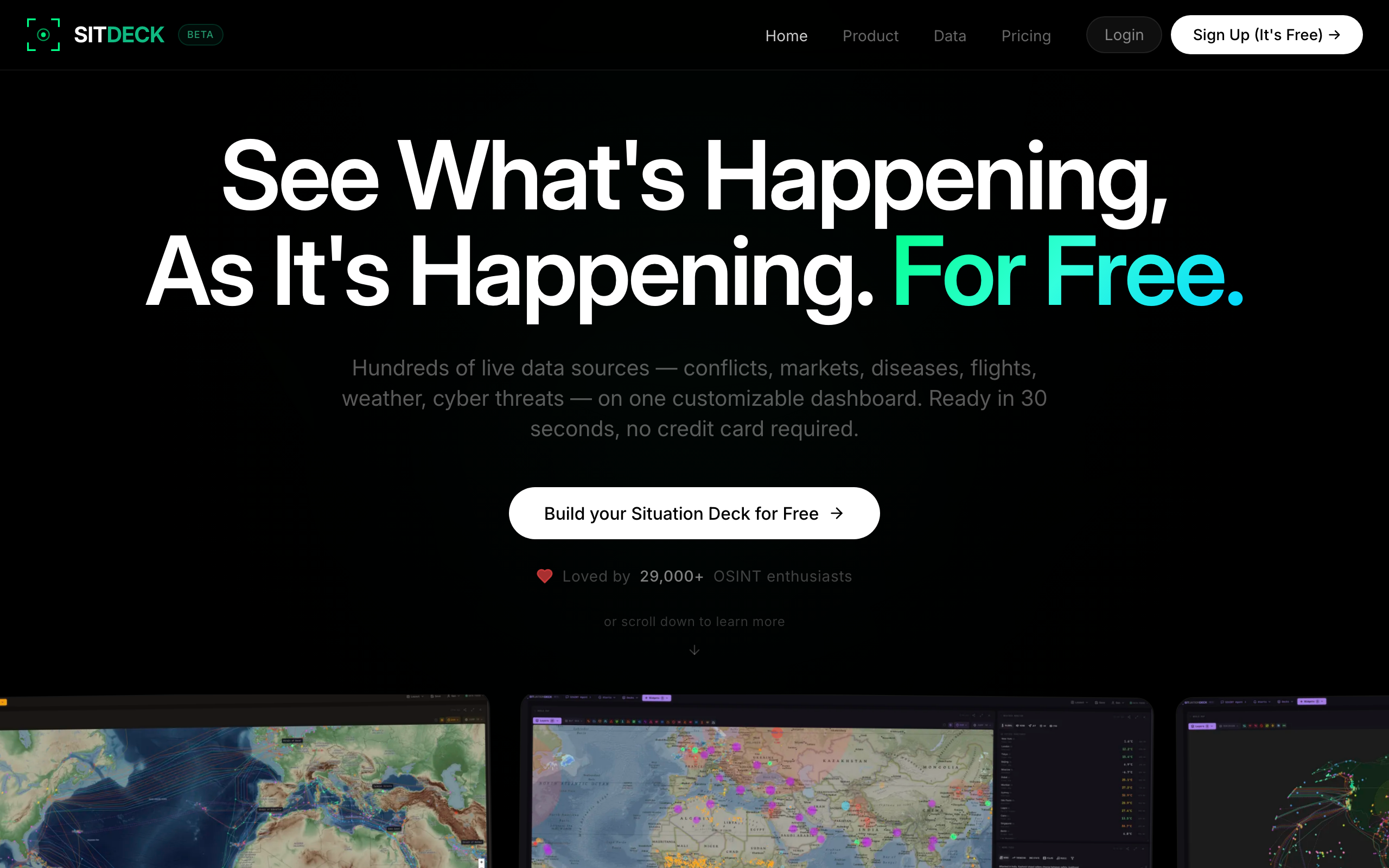 SitDeck is an open-source intelligence dashboard designed to monitor global events, market conditions, and potential threats in real-time. The platform aggregates data from over 180 live data feeds and provides users with 55+ customizable widgets to build personalized dashboards tailored to their specific monitoring needs. The dashboard covers a diverse range of monitoring categories, including geopolitical conflicts, natural disasters like earthquakes, financial markets, and security threats. Users can select and arrange widgets to focus on the information most relevant to their interests or professional requirements. SitDeck is built as a free, open-source tool, making it accessible to journalists, researchers, business analysts, emergency management professionals, and organizations that need continuous situational awareness. The platform incorporates AI-powered analysis capabilities alongside its data aggregation features, enabling users to gain insights from the collected information. As a fully open-source project, SitDeck allows users to access the source code, deploy instances independently, and customize the dashboard according to their specific needs. This approach eliminates licensing costs while providing transparency into how the platform operates and processes data. The combination of extensive data integrations, widget customization, and free availability positions SitDeck as a comprehensive solution for organizations and individuals requiring real-time monitoring across multiple information categories.