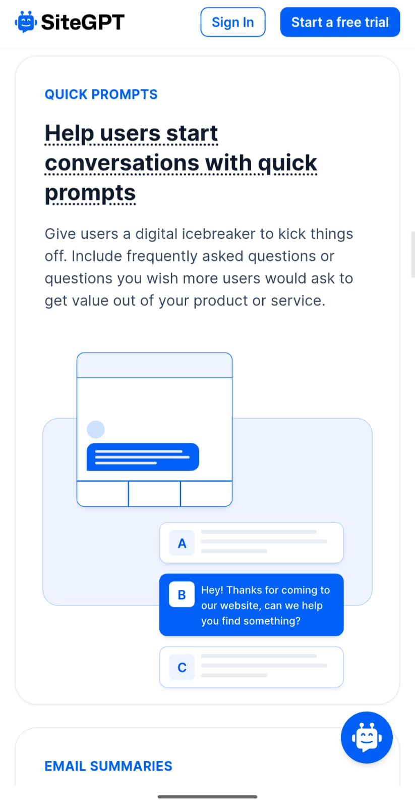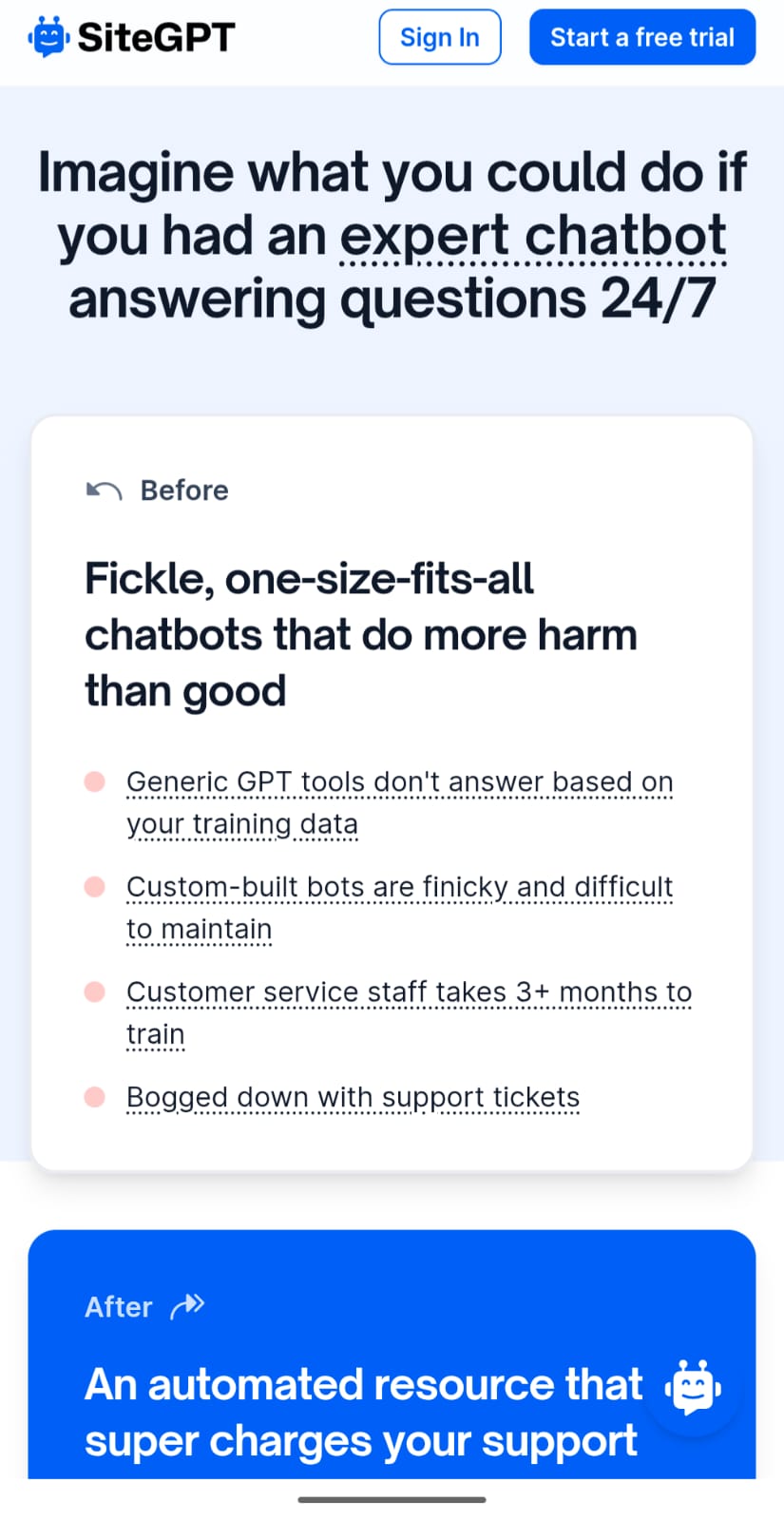 SiteGPT is an AI-powered chatbot tool that enables businesses to deploy a customer service agent trained specifically on their website content. Rather than requiring manual chatbot configuration, SiteGPT uses the information already published on a company's site to automatically answer visitor questions with relevant, contextual responses. The tool functions as a specialized alternative to general-purpose AI assistants, delivering responses based solely on a business's own documentation, product information, and support materials. This approach helps ensure customers receive accurate information aligned with company knowledge while reducing the volume of repetitive inquiries support teams handle. SiteGPT serves businesses of various sizes seeking to improve customer support efficiency and availability. The tool is particularly useful for companies with comprehensive website documentation that can train the chatbot, from SaaS platforms and e-commerce sites to service providers and technical documentation sites. Available as an open-source solution, SiteGPT allows organizations to integrate a personalized AI assistant without extensive custom development. The chatbot can be embedded directly into websites to provide instant responses to common questions, operating 24/7 without human intervention required for routine inquiries. The platform appeals to teams looking to scale customer support capacity while maintaining consistency by grounding responses in official company information rather than relying on a general AI model's broader training data.