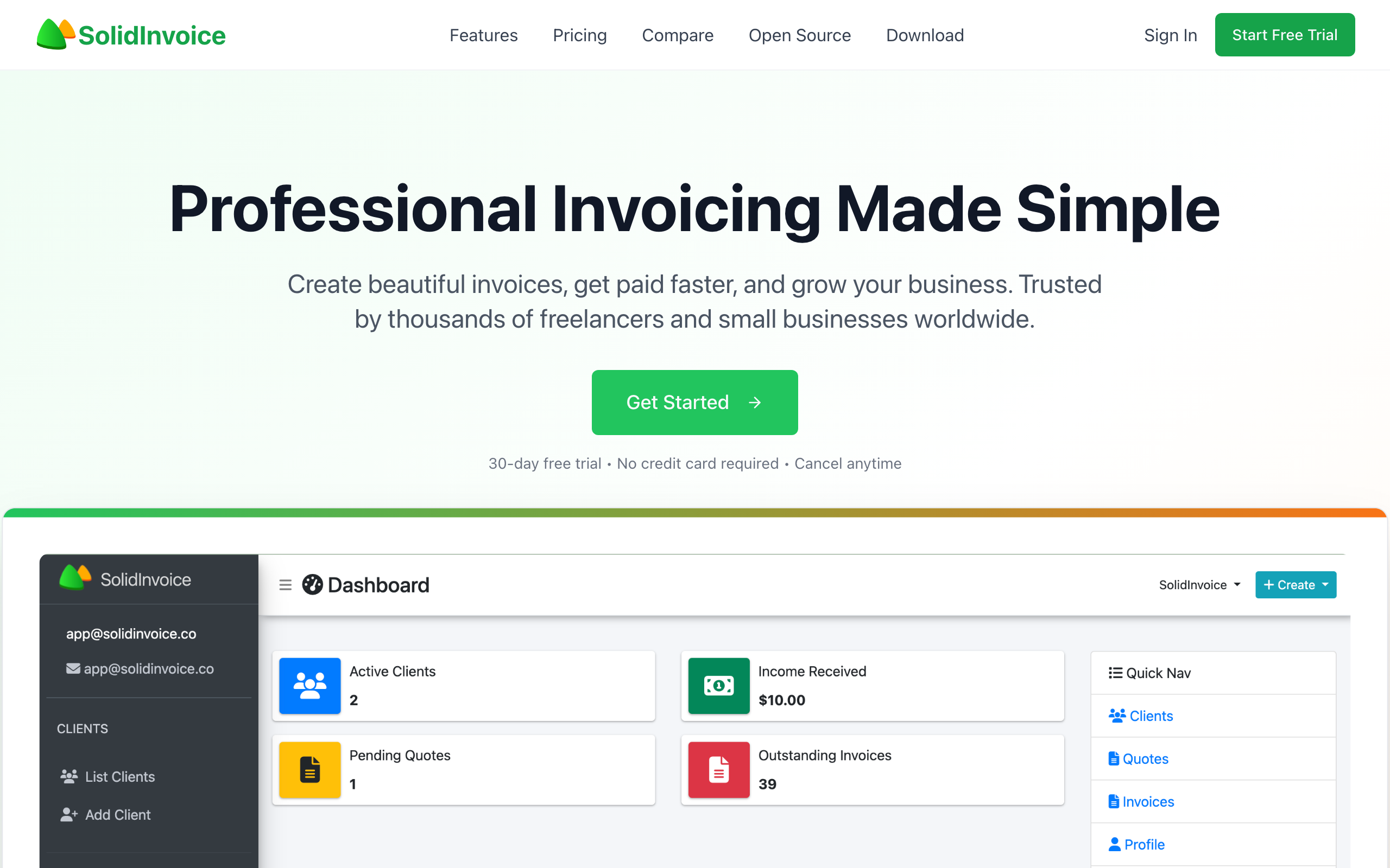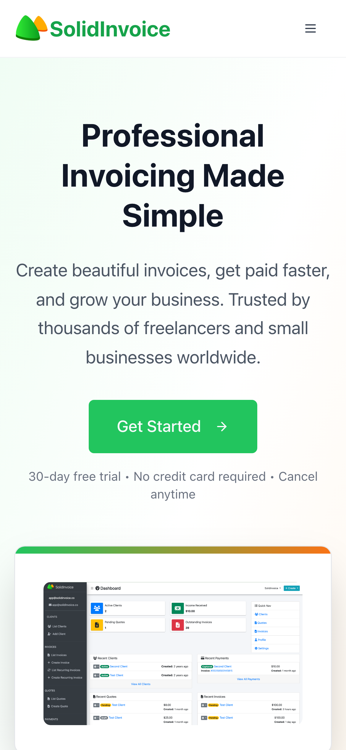 SolidInvoice is an open-source invoicing and quote application built for freelancers and small businesses. The platform streamlines billing operations by providing tools to create and manage invoices, quotes, and client relationships from a single interface. Users can send professional invoices, track payments, set up recurring billing, and accept online payments directly through the application. As an open-source solution, SolidInvoice offers flexibility for users who prefer to self-host or modify the software to suit their specific needs. The project is publicly available on GitHub for community contributions and transparent development. For those who prefer a managed solution, cloud hosting is available starting at $8 per month, with a 30-day free trial to evaluate the platform. The application addresses common pain points for independent professionals and small business owners, including client management, payment tracking, and invoice customization. By consolidating invoicing, quoting, and payment processing in one platform, SolidInvoice helps users reduce administrative overhead and improve cash flow visibility. The combination of open-source accessibility and affordable hosting options makes it accessible to businesses at various stages of growth.