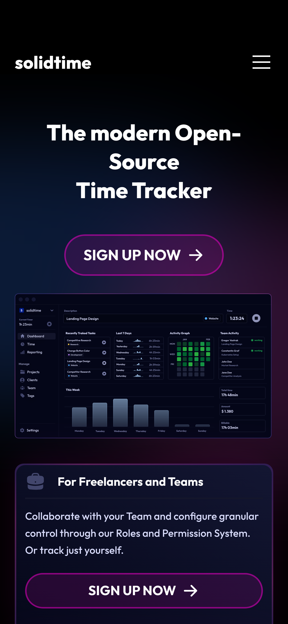 solidtime is an open-source time tracking application designed for freelancers and agencies. The platform enables users to manage projects, tasks, clients, and billing activities within a single unified interface. As a modern alternative to proprietary time tracking solutions, solidtime offers core functionality for recording billable hours while organizing client work and project structures. The application serves professionals who need to track time for multiple clients and projects simultaneously, making it particularly suitable for freelance consultants, service-based agencies, and small teams. By consolidating time tracking with project and client management, solidtime eliminates the need for multiple disconnected tools. As an open-source project, solidtime provides transparency in its codebase and allows organizations to self-host the application, offering an alternative to cloud-only solutions. The project maintains quality standards through automated testing and continuous integration practices. Users can access the complete source code on GitHub, enabling customization and community contributions. The platform is available at no cost, removing licensing barriers for independent professionals and small organizations. solidtime addresses the practical needs of service providers who require accurate time tracking for client billing, project management, and business operations without paying subscription fees.