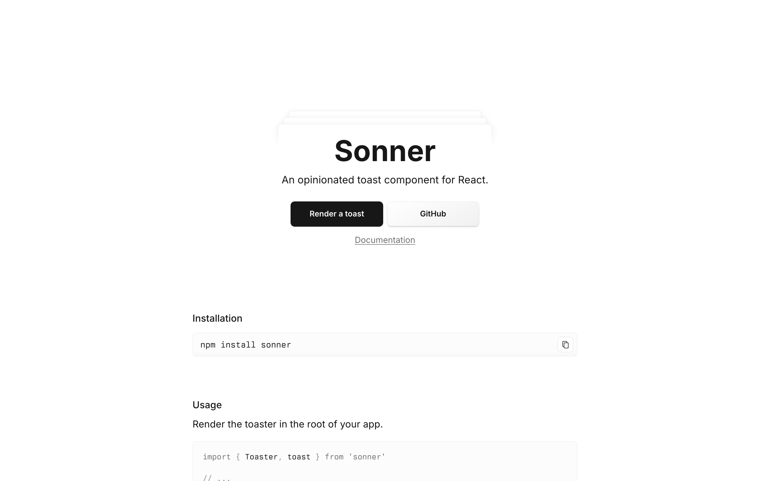 Sonner is an opinionated toast notification component library for React applications. It provides developers with a streamlined way to display temporary notification messages to users by rendering a toast component at the root of their app. The library is built with specific design and functionality choices already determined, reducing the need for extensive configuration while remaining flexible enough for common use cases. The component is designed for React developers who need reliable, consistent toast notifications without building from scratch. Installation is straightforward through npm, requiring only the addition of a `<Toaster />` component to an application's root, after which developers can trigger toasts throughout their codebase. Sonner is open source and free to use, making it accessible to developers of all experience levels. The library includes documentation and a detailed explanation of its design philosophy on the creator's website. The project is actively maintained and available on GitHub, where developers can contribute, report issues, or review the source code. It fills a specific niche in the React ecosystem for teams seeking a pre-built toast solution with sensible defaults and a focus on user experience through thoughtful animations and interactions.