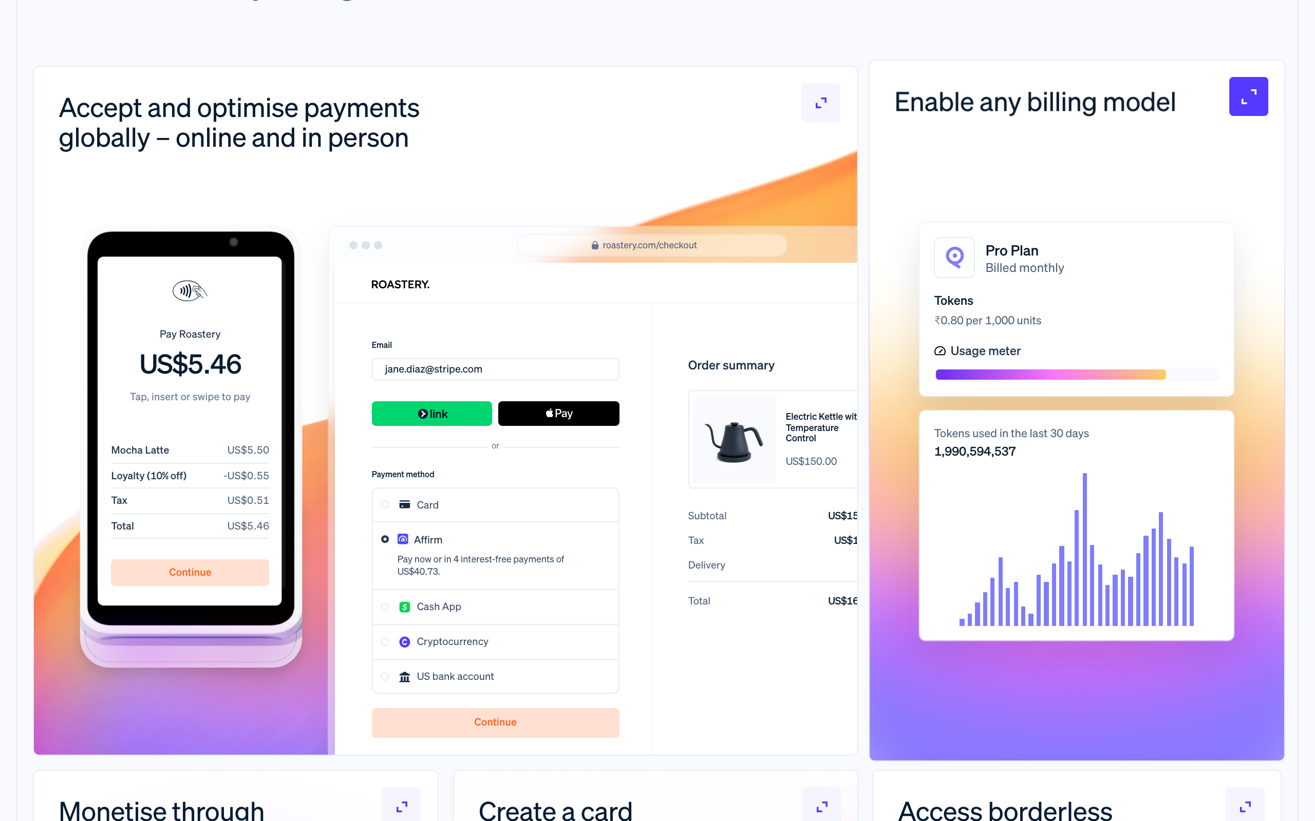 Stripe is a financial services platform designed to help businesses of all sizes accept payments and manage money movement. The platform provides tools for processing payments across multiple channels, including online stores, mobile applications, and in-person transactions. Stripe enables businesses to build custom billing models, manage recurring revenue, and handle complex payment scenarios. The platform serves a wide range of users, from solo entrepreneurs and small businesses to large enterprises. It supports various payment methods and currencies, making it accessible for both domestic and international transactions. Stripe's infrastructure is built to handle payment processing, invoicing, and financial operations through a unified system. Key capabilities include payment acceptance through multiple integration methods, subscription and billing management, fraud detection and prevention, and comprehensive reporting tools. The platform offers API access, allowing developers to build customized payment experiences tailored to specific business needs. Stripe also provides settlement and fund management features, enabling businesses to track and control their money movement. The service is designed with scalability in mind, supporting everything from simple payment collection to sophisticated financial workflows. Stripe's approach combines payment processing infrastructure with tools for managing the financial side of business operations, positioning it as a comprehensive solution for payment and money management needs.