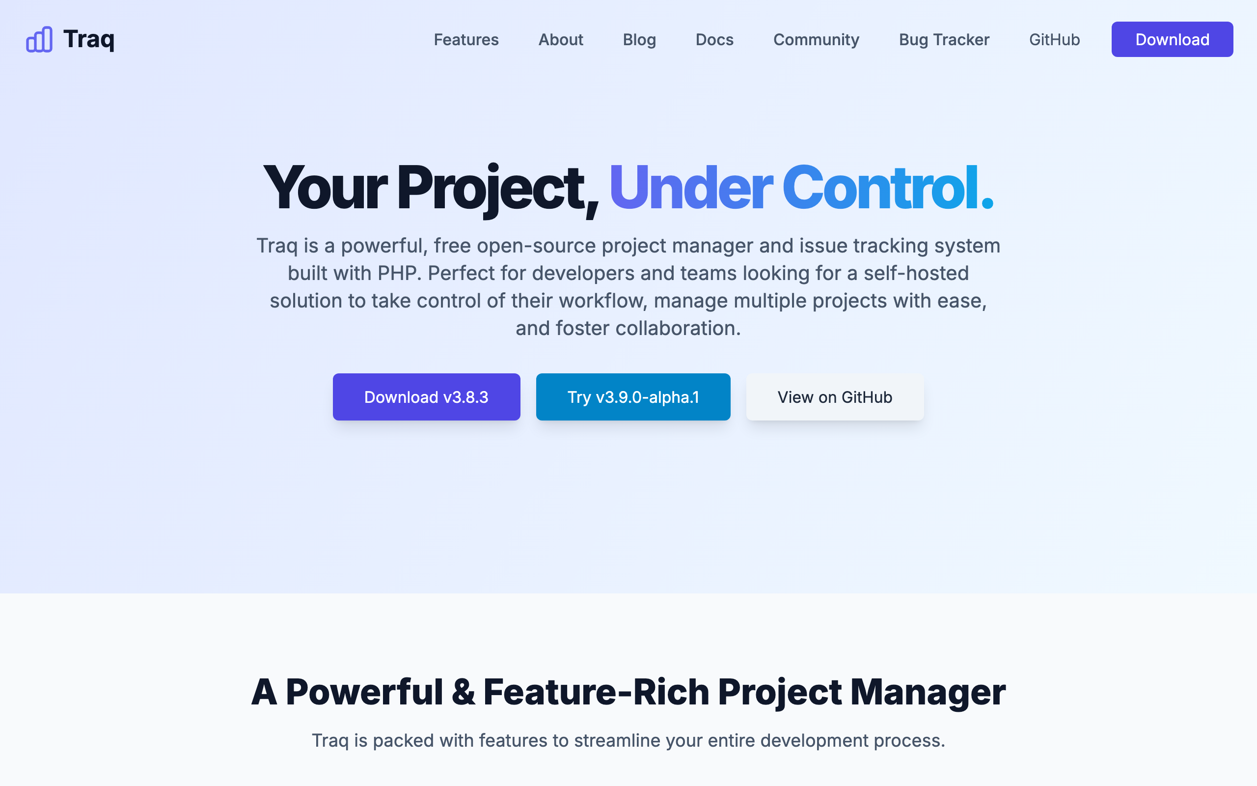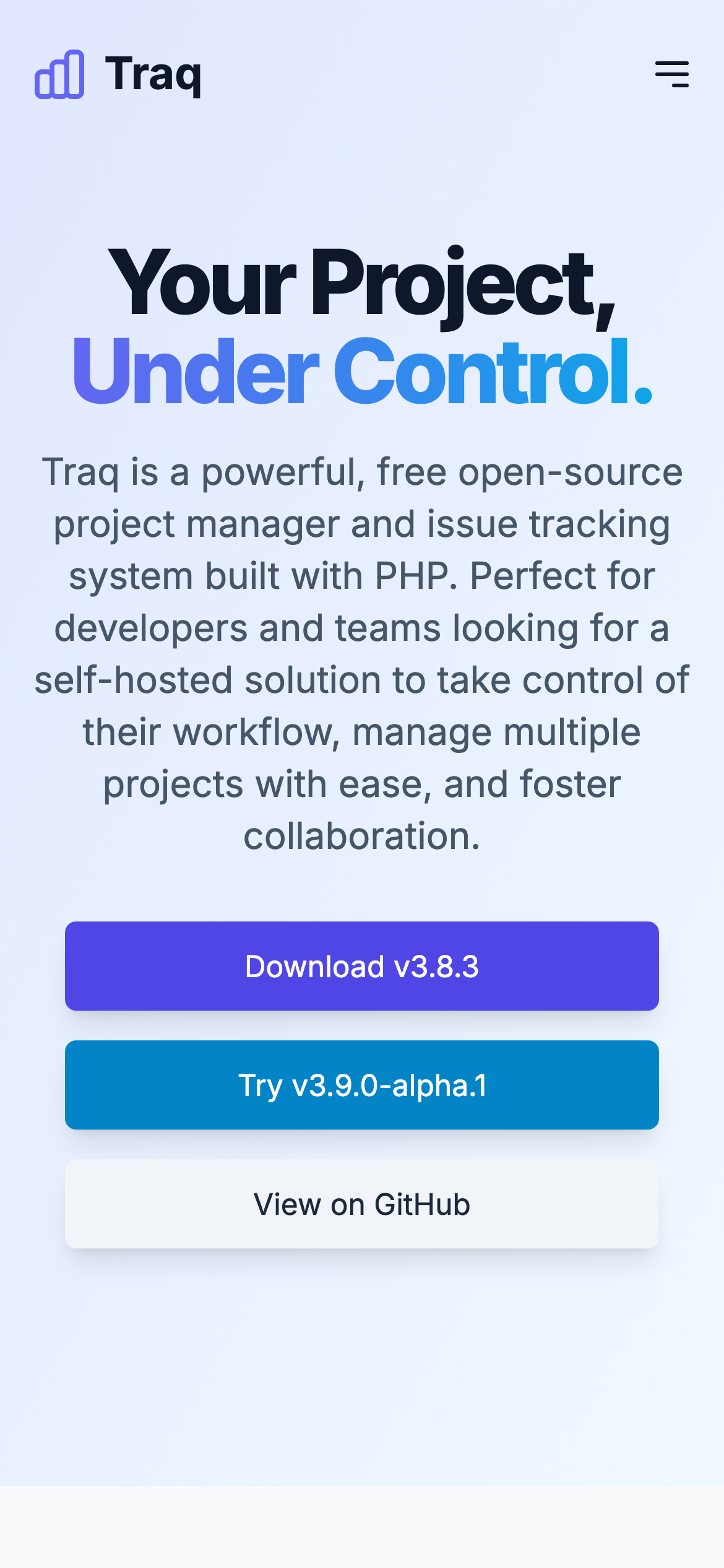 Traq is a free, open-source project management and issue tracking system built with PHP. It enables teams and developers to manage multiple projects, milestones, and sprints through a self-hosted solution that provides full control over project workflow and data. The platform is designed for organizations seeking an alternative to cloud-based project management tools. Users can track issues across projects, organize work into sprints and milestones, and collaborate with team members. As a self-hosted solution, Traq allows teams to maintain their own infrastructure and keep project information on their own servers. Traq requires PHP 8.3 or higher, MariaDB or MySQL, and a web server configured to support URL rewriting. The installation process involves cloning the repository, installing PHP and Node dependencies through Composer and pnpm, and building the user interface. The project is actively maintained on GitHub and distributed under an open-source license, making it accessible for teams of any size. Its lightweight architecture and self-hosted nature make it suitable for organizations with specific compliance requirements or those preferring to manage their own development infrastructure. Traq serves as a straightforward alternative for teams looking to reduce reliance on third-party project management services while maintaining essential issue tracking and project planning capabilities.