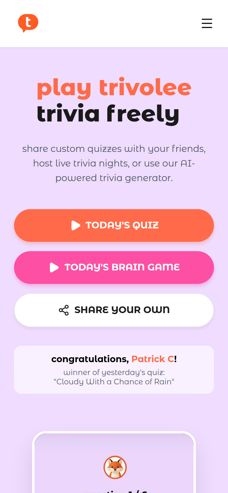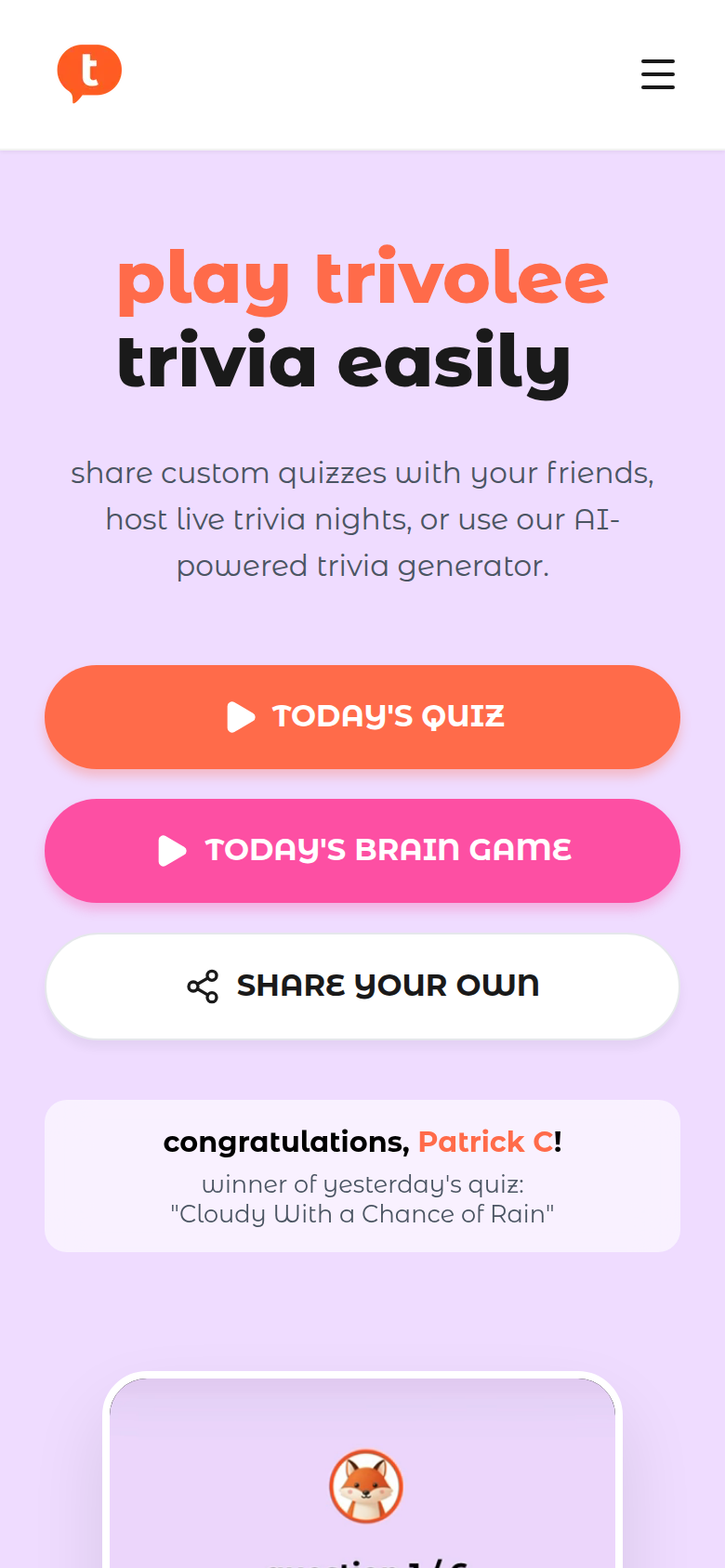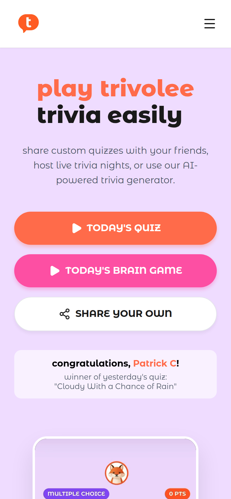 Trivolee is a free trivia platform that enables users to play quiz games individually or with others. The service supports multiple play modes, including solo gameplay to compete on leaderboards, casual matches with friends and family, and organized games for coworkers. The platform features custom quiz creation, allowing users to build personalized trivia sets tailored to specific topics or groups. This functionality makes trivolee suitable for educational settings, team-building activities, casual social gatherings, or personal knowledge testing. Trivolee accommodates various use cases through its flexible game hosting system. Players can join live trivia sessions in real-time or challenge themselves against existing leaderboards when playing independently. The ability to create custom content distinguishes it from standard trivia apps, as users can design questions specific to their needs rather than relying solely on pre-made content. The platform is accessible through its web interface at trivolee.com with no required payment or subscription. It appeals to individuals seeking casual entertainment, groups looking for interactive activities, and educators or team leaders needing engagement tools. The combination of free access, customizable content, and multiple play modes positions trivolee as a flexible option for trivia-based engagement across personal, professional, and educational contexts.