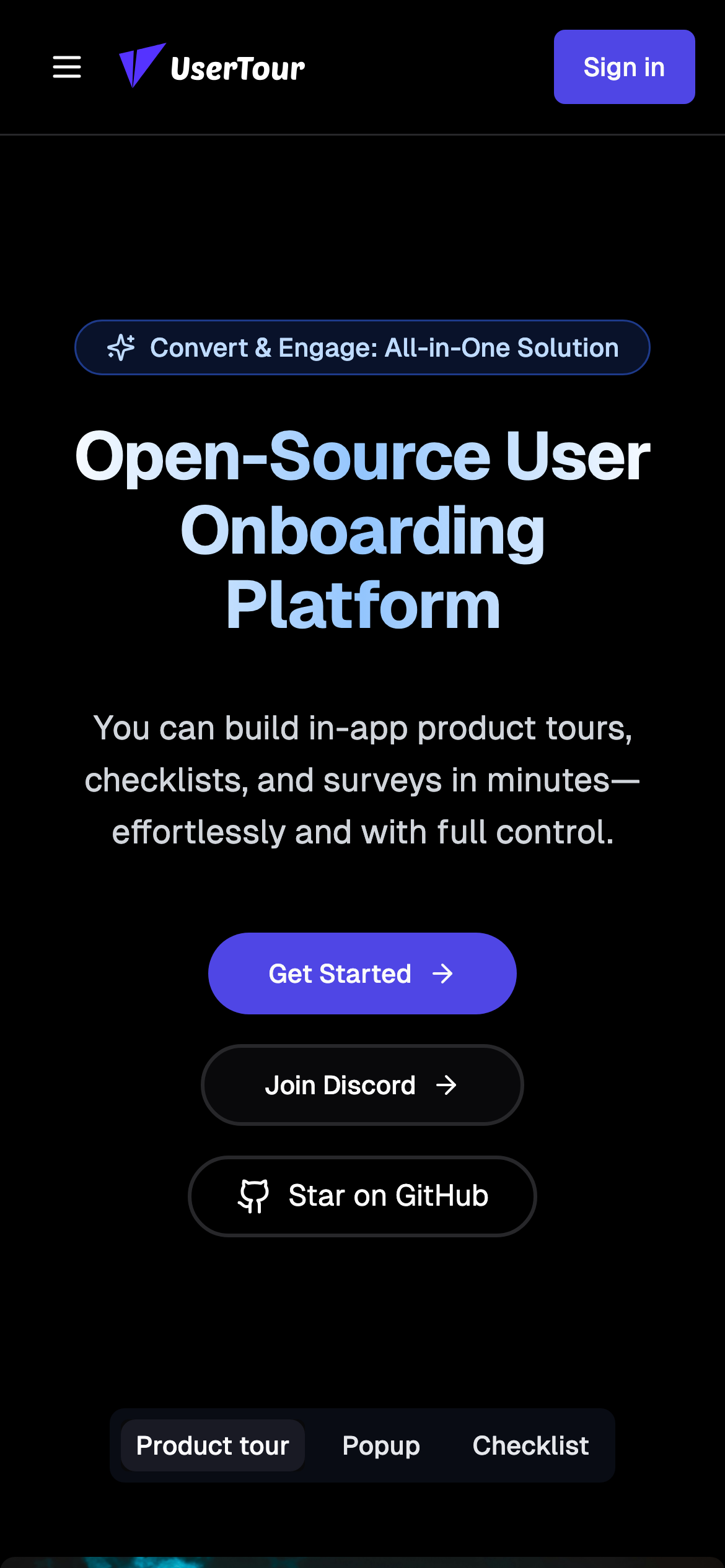 Usertour is an open-source user onboarding platform designed to help teams create in-app product tours, checklists, and surveys without requiring extensive development effort. The platform enables product managers, designers, and growth teams to build personalized user experiences that guide new and existing users through product features and workflows. The software serves organizations looking to improve user engagement, accelerate feature adoption, and increase user retention through interactive onboarding experiences. Usertour positions itself as an open-source alternative to proprietary solutions like Appcues, Userpilot, Userflow, and Chameleon, making it accessible to teams of any size without licensing costs. Key capabilities include the ability to design guided tours, track user progress through checklists, and gather feedback via in-app surveys. The platform emphasizes ease of use, allowing creation of these elements in minutes rather than hours. Being open-source, Usertour offers transparency and the flexibility for teams to self-host or modify the codebase to suit specific requirements. The product is available under an open-source license through GitHub, making it suitable for organizations prioritizing cost-effectiveness, data control, or the ability to customize their onboarding infrastructure. It appeals to product teams, SaaS companies, and enterprises seeking to streamline user education and engagement without vendor lock-in.