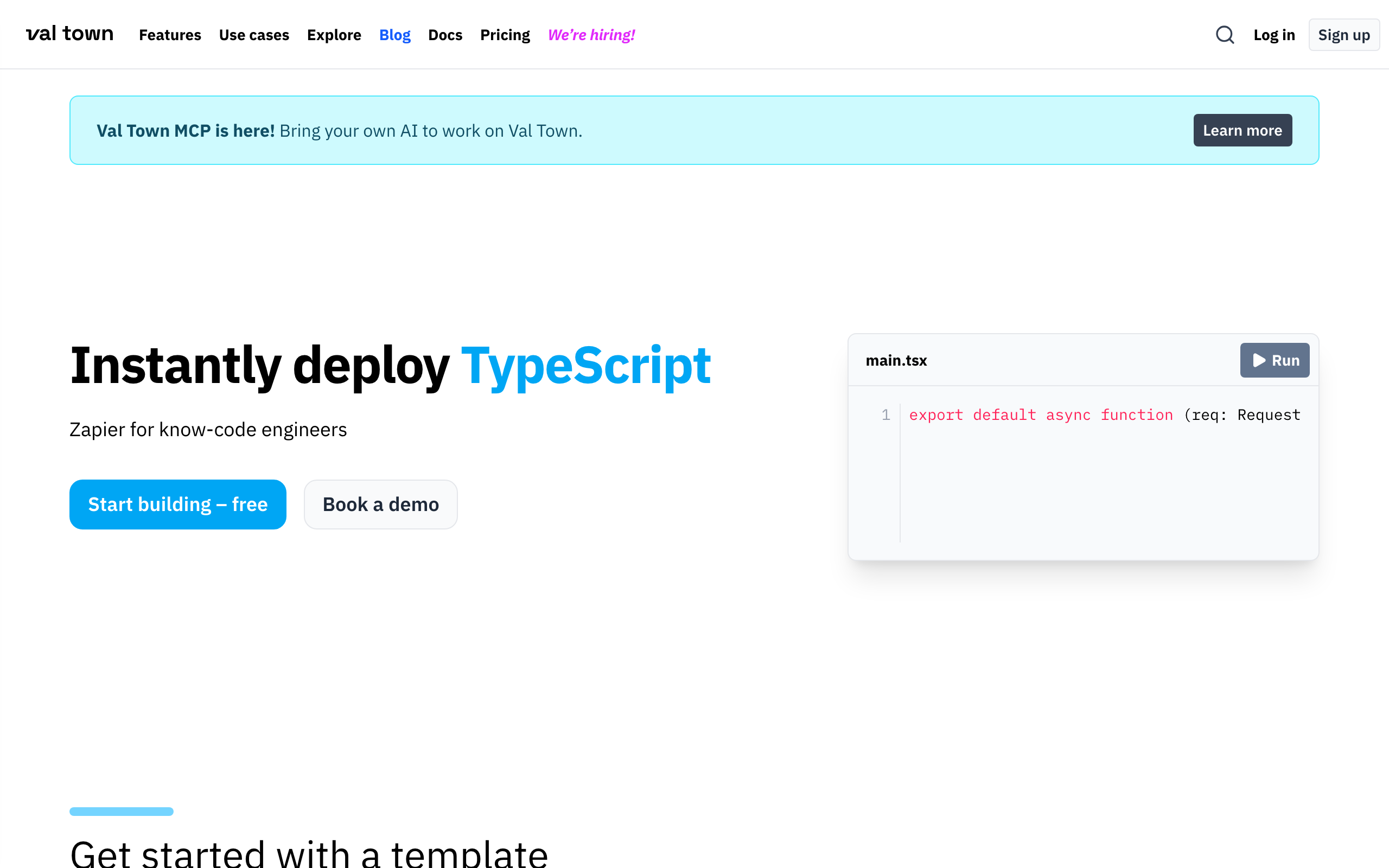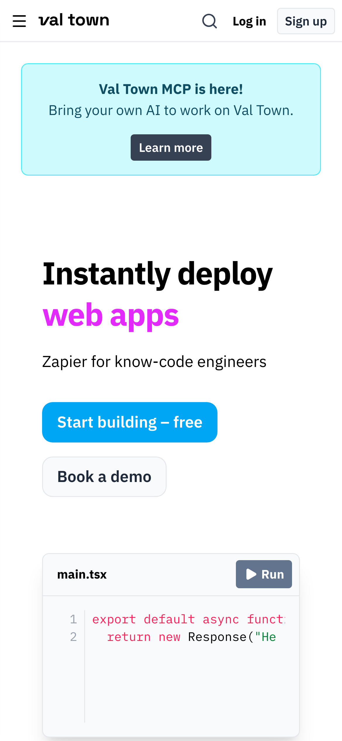 Val Town is an open-source platform designed for developers who need to quickly deploy TypeScript automations. It enables users to create and run serverless functions written in TypeScript without requiring infrastructure setup or deployment complexity. The platform serves developers, automation engineers, and technical teams in go-to-market (GTM) and artificial intelligence workflows. Common use cases include building integrations, automating business processes, creating API endpoints, and developing AI-powered applications that need rapid iteration. Key features include instant deployment capabilities, a TypeScript-first development environment, and built-in support for common automation patterns. The platform abstracts away infrastructure concerns, allowing developers to focus on writing code rather than managing servers or deployment pipelines. Val Town distinguishes itself through its emphasis on simplicity and speed. The open-source nature provides transparency and allows for community contributions. The platform supports both standalone automations and integrations with external services, making it suitable for teams building AI applications or GTM tooling that require quick updates and iterations. The service is accessible to developers of varying experience levels, from those building simple automations to teams developing more complex AI-driven solutions. By removing deployment friction, Val Town enables faster experimentation and iteration cycles for automation projects.