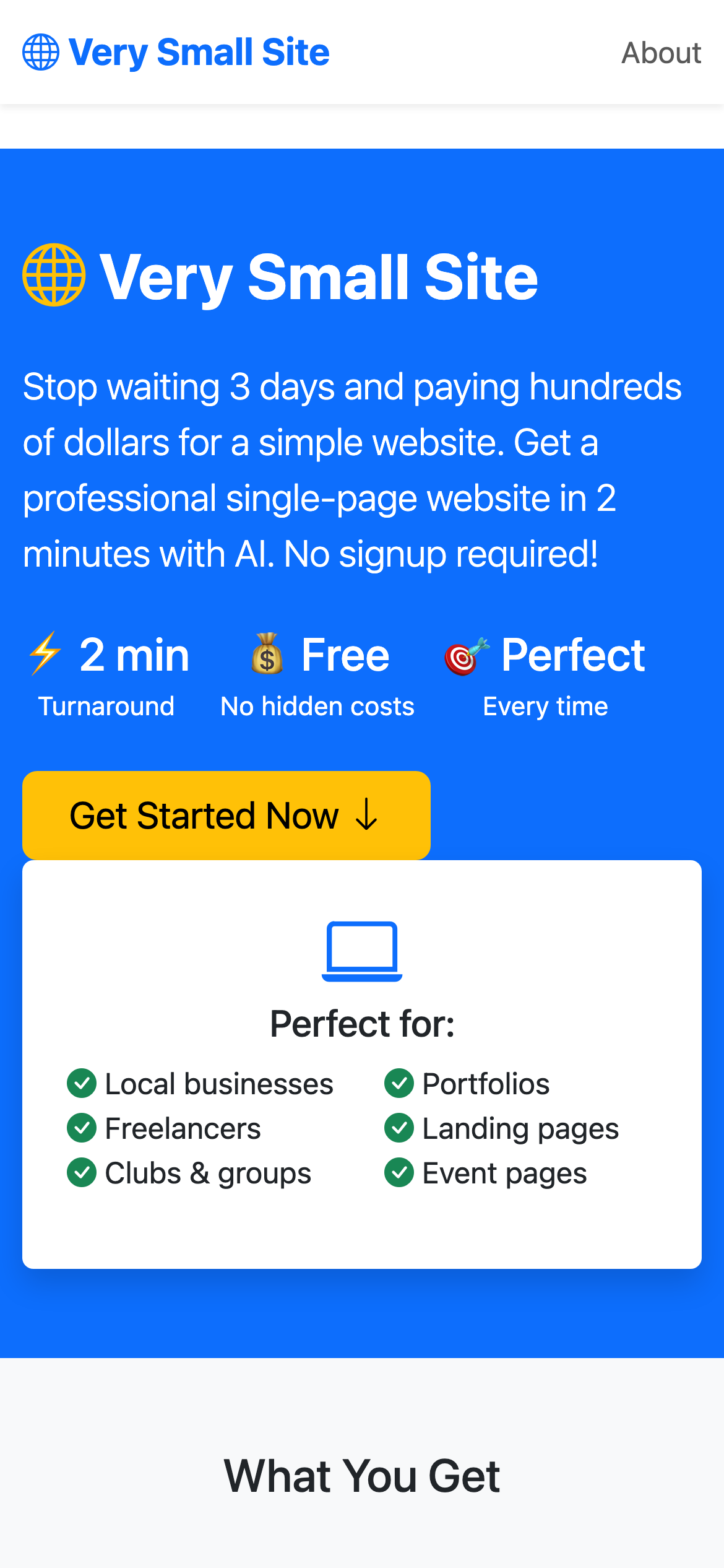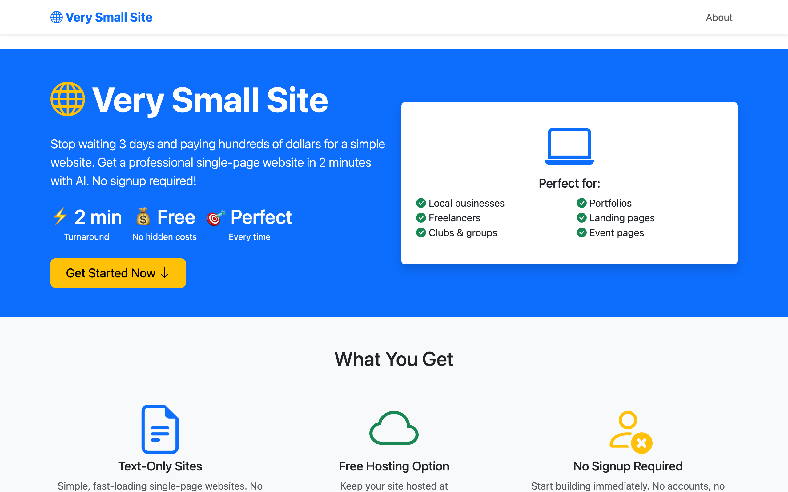 Verysmall.site is a website builder that generates professional single-page websites through conversational AI interaction. Users can create and deploy a complete site in minutes by simply describing what they want in plain English, without requiring technical knowledge or coding experience. The platform is designed for non-technical users who need straightforward web presence quickly—small businesses, freelancers, professionals, and individuals seeking an alternative to traditional web design services. Rather than waiting days or spending hundreds of dollars on custom development, users can have a functional, professionally-designed site live immediately. Verysmall.site offers free hosting at verysmall.site/yourname, with the option to download and self-host the generated code elsewhere. The resulting websites are lightweight single-page applications with no complex backends or databases, ensuring fast load times and simple maintenance. Updates and modifications are handled through natural language conversation with the AI assistant. Users can add content, make changes, or fix issues by describing desired updates without touching code. The service requires no signup, email verification, or account creation—users simply choose a name and start building. The generated sites are clean, professional, and optimized for performance, making Verysmall.site a practical solution for anyone needing quick website creation without technical barriers or significant investment.