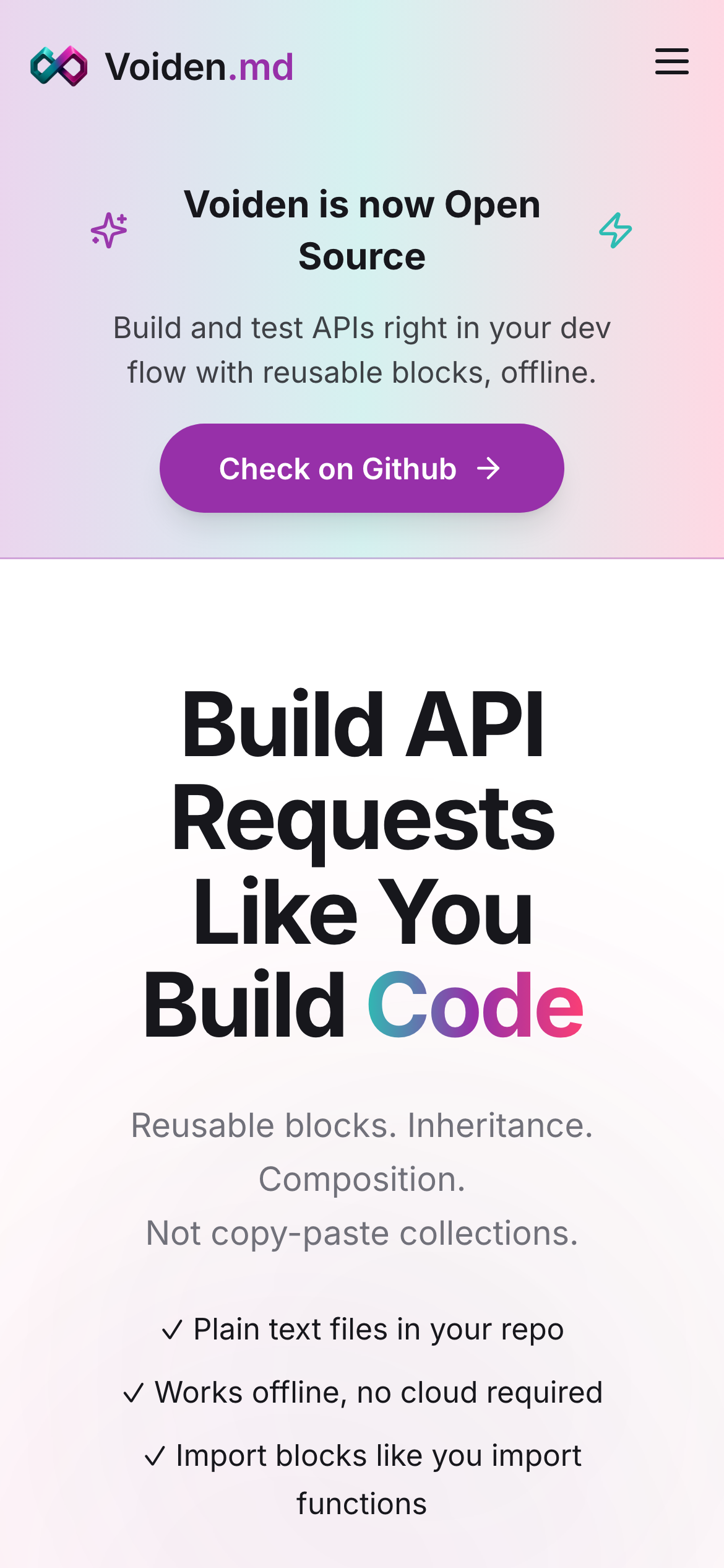 Voiden is a free, open-source API client designed for developers who work with Git-based workflows. It functions as an offline-first workspace where API definitions, documentation, tests, and mocks coexist in a single, version-controlled environment using programmable Markdown blocks. The tool addresses common frustrations in API development: cloud synchronization lock-in, paywalled core features, unnecessarily complex interfaces, and performance lag. By operating offline-first and integrating directly with Git, Voiden allows teams to manage their entire API workflow without cloud dependencies or subscription requirements. Voiden is built for developers and teams who prefer local-first tools that integrate with their existing version control practices. Rather than relying on cloud platforms or browser-based solutions, users maintain complete control over their API specifications and tests through Git repositories. The project is available as open-source software on GitHub, making it suitable for individual developers, small teams, and organizations seeking transparent, customizable API tooling. Its Markdown-based approach keeps API documentation and tests human-readable and easily diffable within Git commits, supporting collaborative development workflows.
