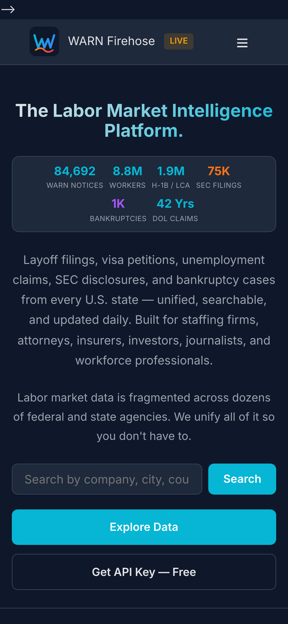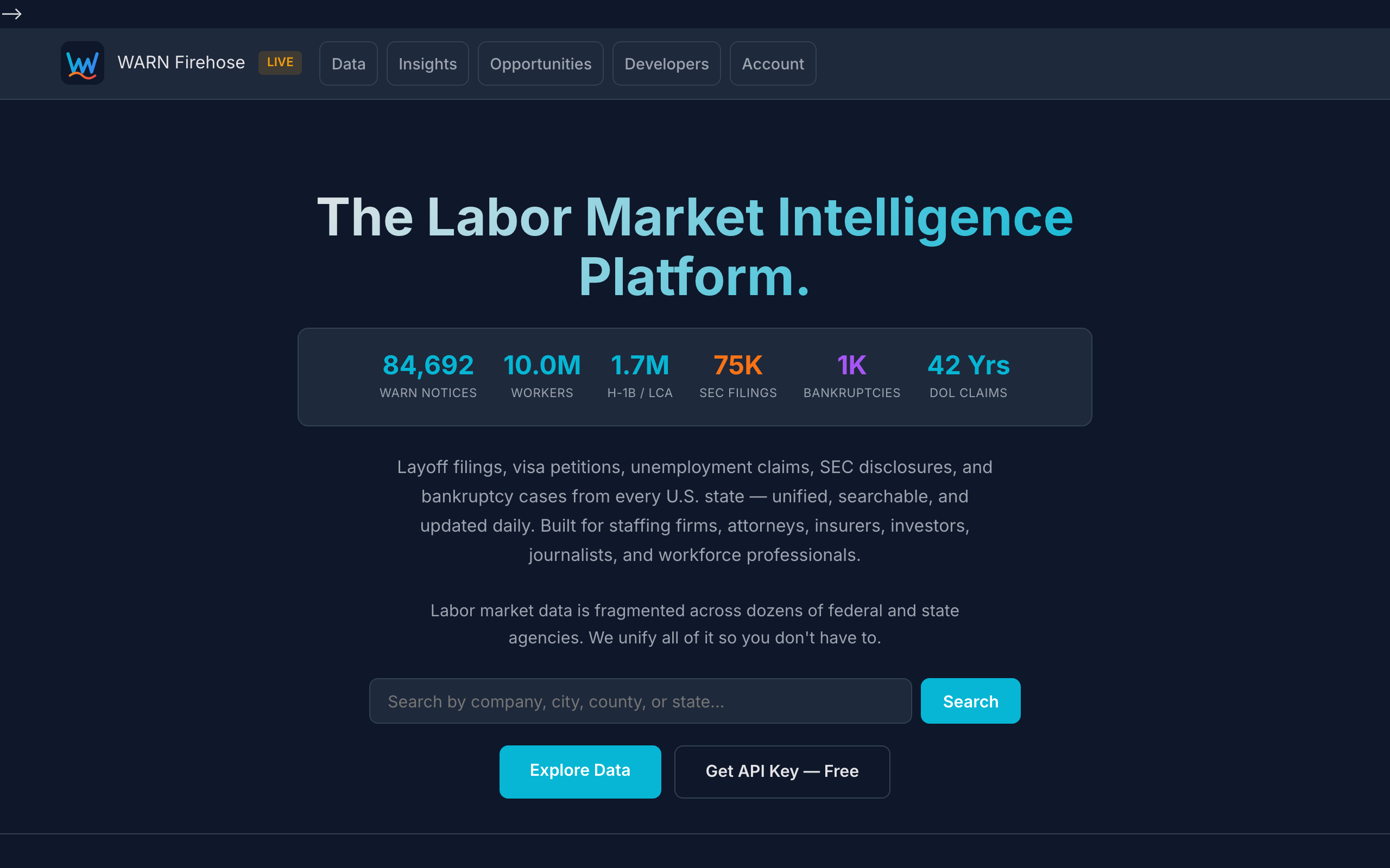 WARN Firehose is an open-source analytics platform that aggregates WARN Act notices from all 50 U.S. states into a single, searchable database. The WARN Act requires companies with 100+ employees to file public notices 60 days before mass layoffs, but these notices are scattered across fragmented state websites with inconsistent formats and accessibility issues. WARN Firehose consolidates this data and supplements it with related information including H-1B visa data, unemployment claims, SEC filings, and bankruptcy cases. The platform is designed for researchers, journalists, economists, HR professionals, and anyone tracking employment trends and layoff patterns across the United States. By centralizing data that is legally public but practically difficult to access, it removes barriers to understanding mass layoff activity. The database contains over 84,000 WARN Act notices and is updated daily to reflect new filings. As an open-source project, WARN Firehose prioritizes accessibility and transparency. Users can search and analyze layoff data without paywalls or usage restrictions, making it suitable for both individual researchers and organizations conducting labor market analysis.