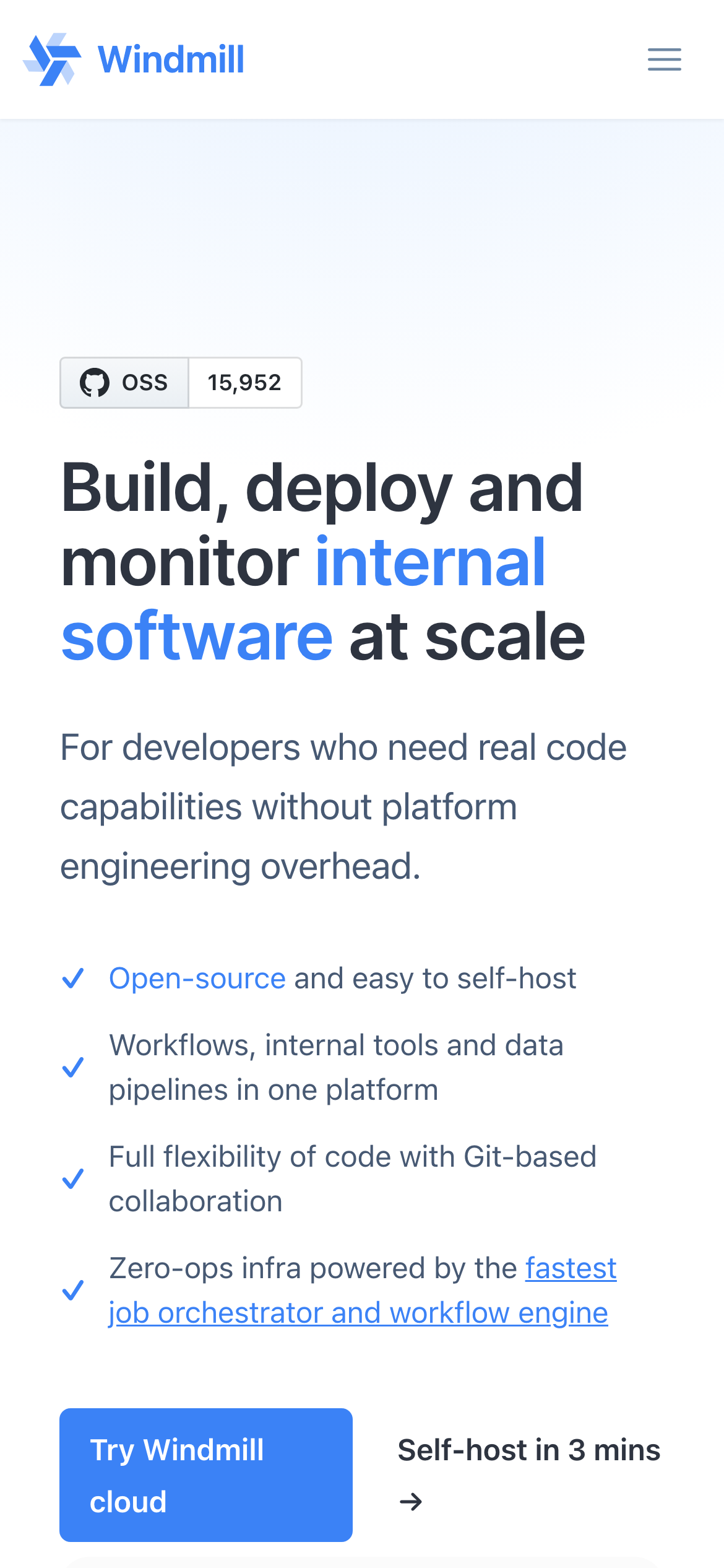 Windmill is an open-source developer platform designed for building scripts, workflows, data pipelines, and internal tools. It serves as a self-hostable alternative to platforms like Retool, Pipedream, and Superblocks, offering developers a way to create APIs, background jobs, and user interfaces without extensive boilerplate code. The platform automatically converts scripts into shareable UIs and enables developers to compose multiple scripts into workflows and internal applications. It supports both autogenerated and custom interfaces for triggering workflows, making it accessible for teams building internal tools at scale. Windmill is built with developers and AI integration in mind, featuring enterprise-grade security alongside its open-source model. The platform emphasizes self-hosting capabilities, giving organizations control over their infrastructure and data. It simplifies workflow orchestration compared to more complex tools like Temporal while providing the flexibility to handle complex automation scenarios. The project is maintained on GitHub and provides a collaborative environment for contributions and customization. Windmill targets backend development teams seeking to reduce development time for internal applications and automation workflows through a unified platform that bridges scripting, orchestration, and UI generation.