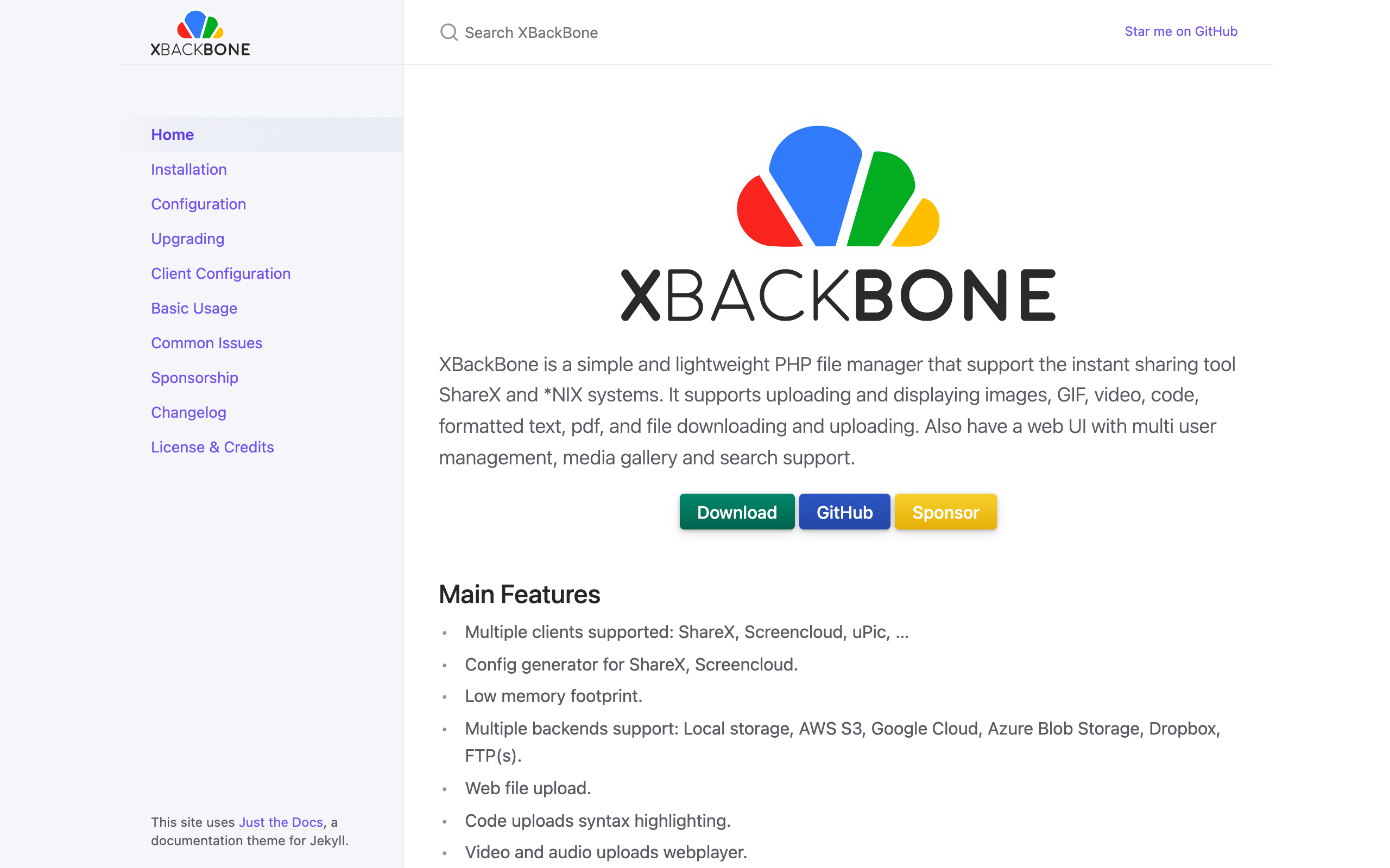 XBackBone is a lightweight, open-source file manager built with PHP that streamlines file sharing and management. Designed for users who need quick access to upload, organize, and share files, XBackBone integrates seamlessly with ShareX, a popular screenshot utility, enabling instant sharing of captures and other media directly from the desktop. The platform supports a wide variety of file types including images, GIFs, videos, code files, formatted text, and PDFs. It provides a web-based interface with multi-user management capabilities, allowing teams or multiple users to maintain separate accounts and access controls. The application includes a media gallery for browsing uploaded content and search functionality for locating files. XBackBone runs on *NIX systems and offers both file uploading and downloading through its intuitive web UI. As a lightweight solution, it places minimal demands on server resources while delivering core file management functionality. The project is entirely open-source, with source code available on GitHub, making it suitable for self-hosting and customization. XBackBone appeals to developers, content creators, and organizations seeking a straightforward alternative to heavier file management systems without licensing costs.