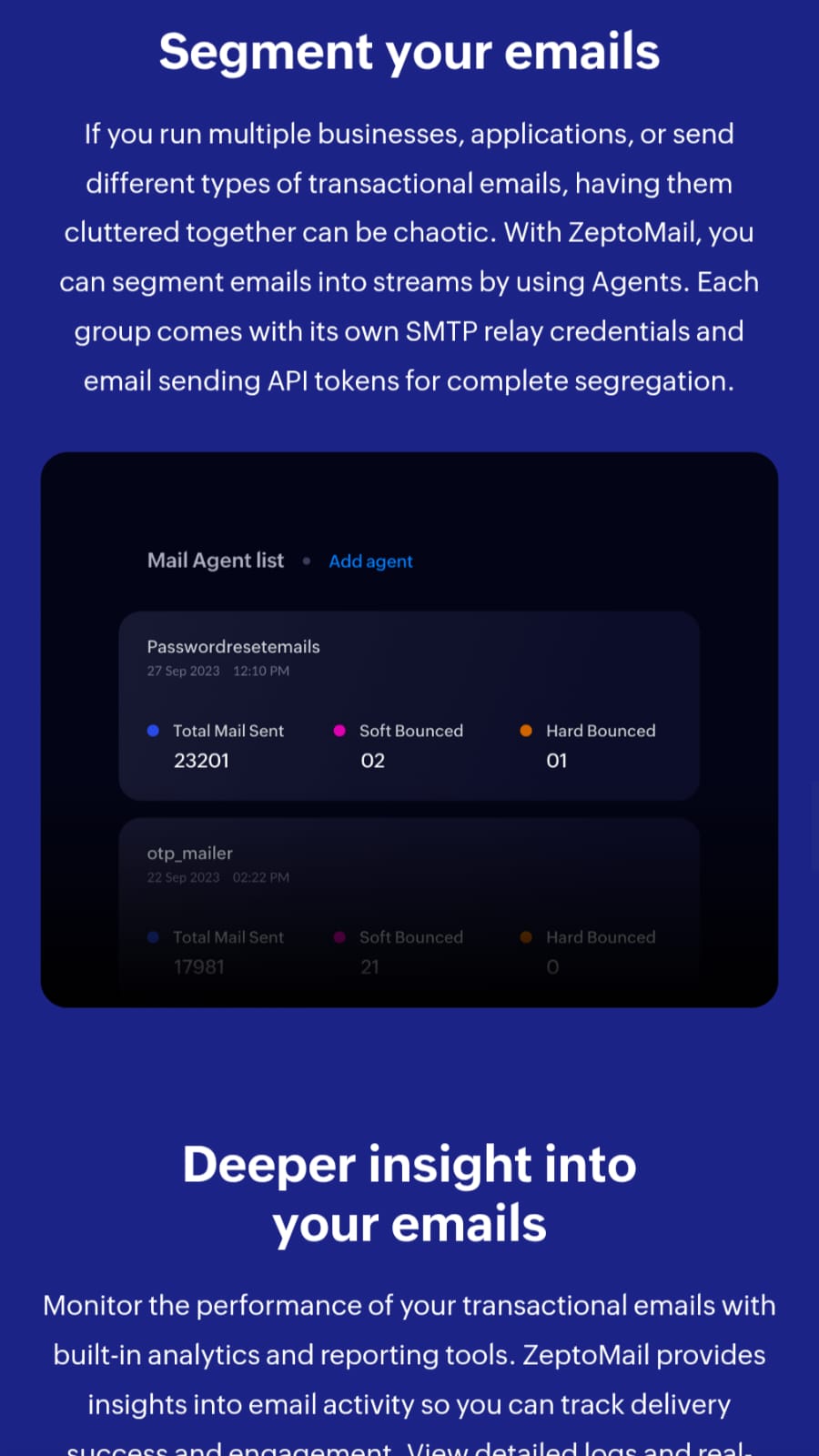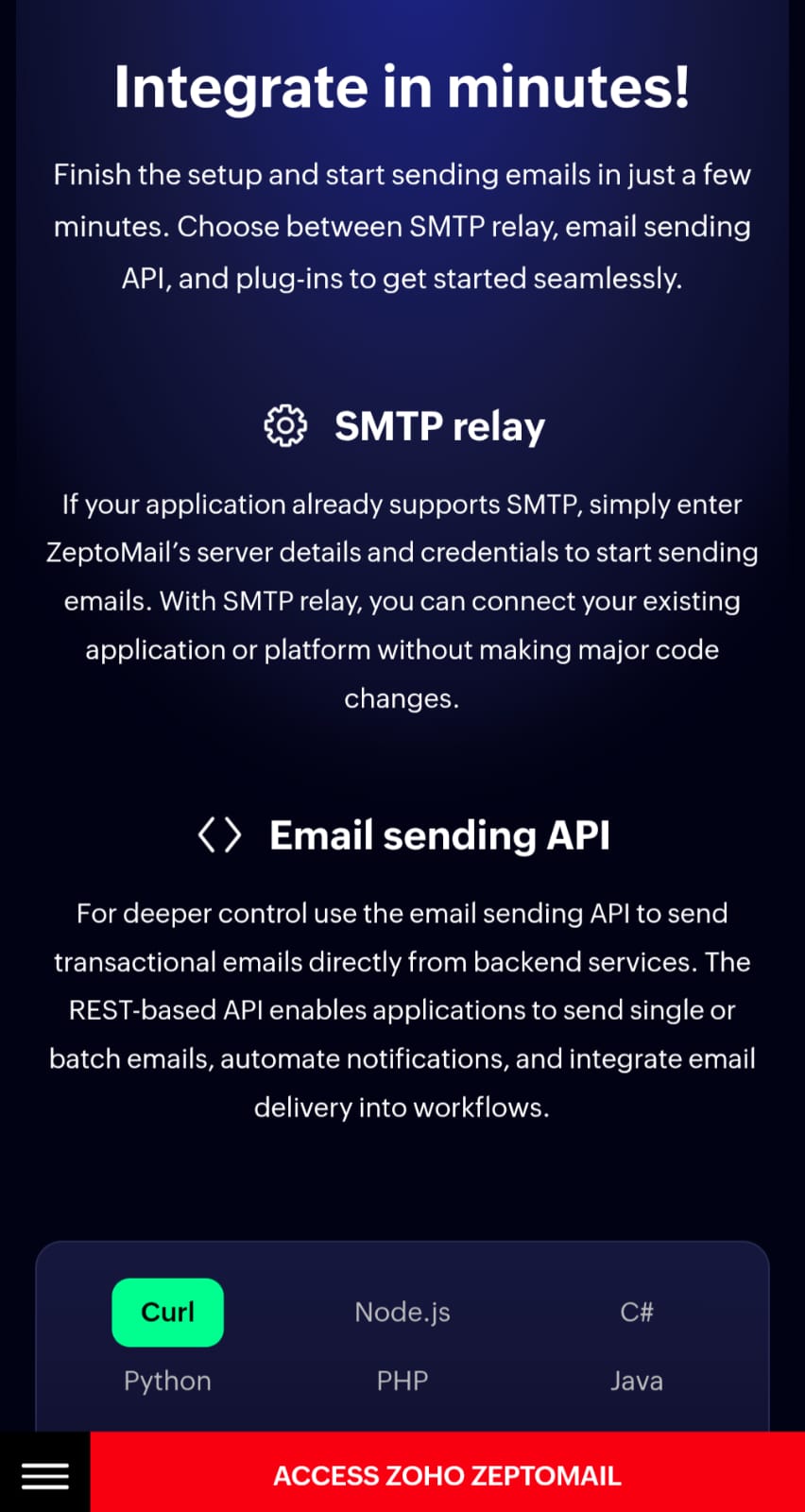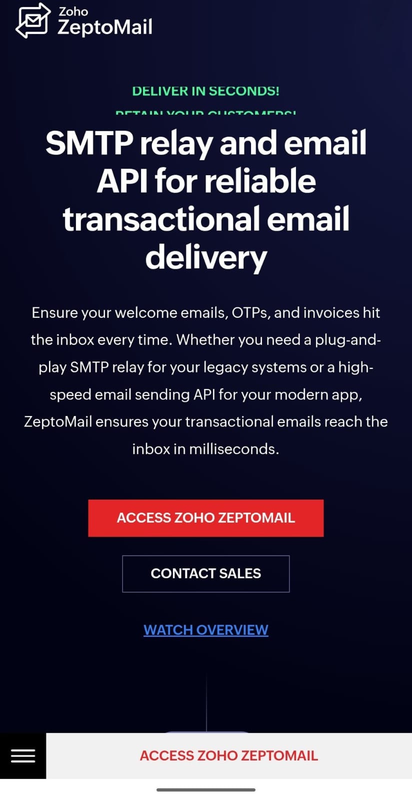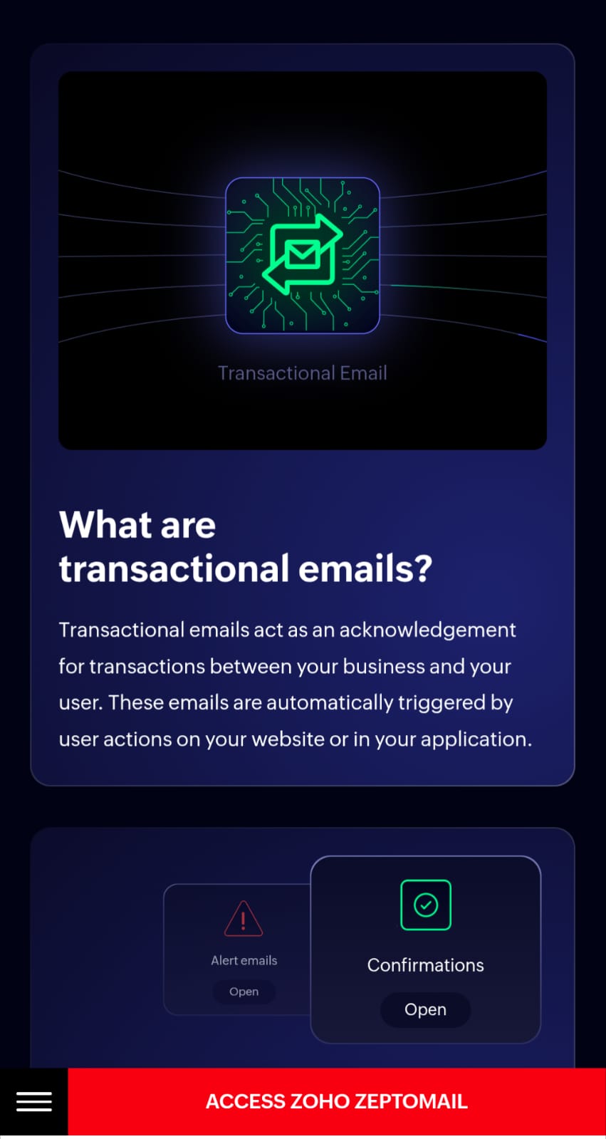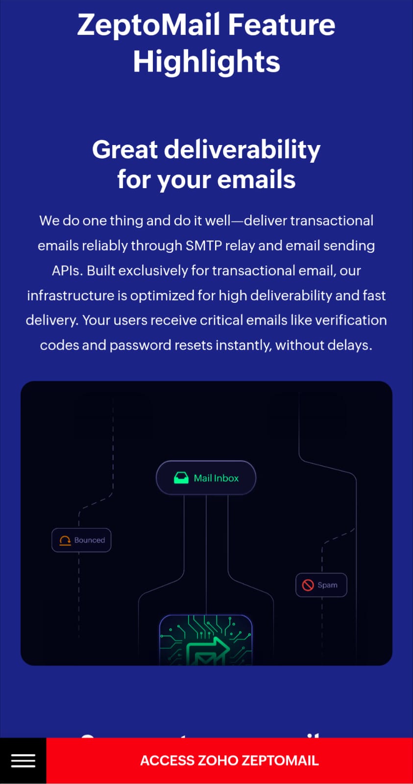 ZeptoMail by Zoho is an SMTP relay and email API service designed for reliable transactional email delivery. The platform enables businesses to send time-sensitive emails such as welcome messages, one-time passwords (OTPs), password resets, and invoices with high deliverability rates directly to recipient inboxes. The service caters to organizations with varying technical needs. It offers a plug-and-play SMTP relay solution for legacy systems and applications, as well as a high-speed email API for modern web and mobile applications. This dual approach allows both established infrastructure and contemporary development environments to integrate transactional email capabilities without significant refactoring. ZeptoMail emphasizes inbox delivery and speed, processing email sends in milliseconds. The service handles the technical complexities of email authentication, spam filter navigation, and bounce management, allowing development teams to focus on core application functionality rather than email infrastructure challenges. The platform is suited for SaaS companies, e-commerce businesses, fintech applications, and any organization requiring dependable transactional email delivery at scale. By managing deliverability concerns centrally, ZeptoMail helps reduce the operational burden of maintaining in-house email infrastructure while improving the reliability of critical customer communications.